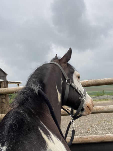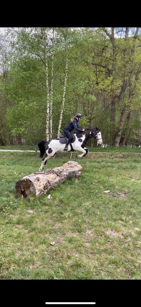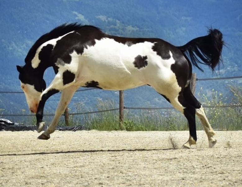FOREVER OVER HOTWHEEL Paint Horse, French and American papers Gelding, Black Overo, born June 2014 (9 years) Sire: DARK DD HOTWHEEL (BEL) Paint Horse Dam: APPLE OVER THE MOON Paint Horse Dam's sire: ONE FLASHY CASH BOY (CAN) Paint Horse Over is an intelligent and refined horse, known for his thoughtful nature and affectionate temperament. Powerful with beautiful gaits and very responsive to voice and seat commands, he has just enough energy to enjoy long rides without getting bored, yet remains very obedient. He is well-trained in arena work but is primarily an excellent outdoor horse, ideal for extensive trail riding. Mostly ridden alone (accustomed to vehicles, cars, quads, tractors… all terrains). He will appreciate someone who cares for him deeply, as he forms a strong bond with his rider. Once trust is established, he can read your intentions without you even needing to ask! Located in the department 72. Currently shod on the front legs, but can also go barefoot with hoof boots. He currently lives in a paddock with two companions. He is also familiar with stable life. More information available upon request.