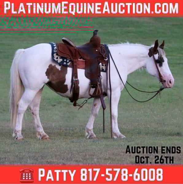 ONLINE AUCTION Place your bids at www.PlatinumEquineAuction.com Starting Bid $3500 Auction ends October 26th, 2025 Need a new saddle? Check out White Rock Saddles on our website or Facebook Patty-Cake is a 13-year-old gorgeous stocky paint pony mare. She stands 13.2 and is as wide as she is tall. She is a sweet girl that loves people and belly scratches. Patty has been ridden by all ages, both in town and out on the ranch. She is fun to ride and gets compliments everywhere she goes. She rides out quiet alone or with other horses and will go where you point her. Patty enjoys cruising at slower speeds but will trot/lope smooth and easy when asked. She picks up her leads correctly and stops great. She is easy to groom, saddle, bathe, and is a very easy keeper. She is current on everything; dental, farrier, shots, and deworming and is ready to go to her forever home. To come see this little lady in Stephenville Texas, please call/text Tiffany Smith 817-578-6008 if you have any questions. ONLINE AUCTION Place your bids at www.PlatinumEquineAuction.com Starting Bid $3500 Auction ends October 26th, 2025 Need a new saddle? Check out White Rock Saddles on our website or Facebook