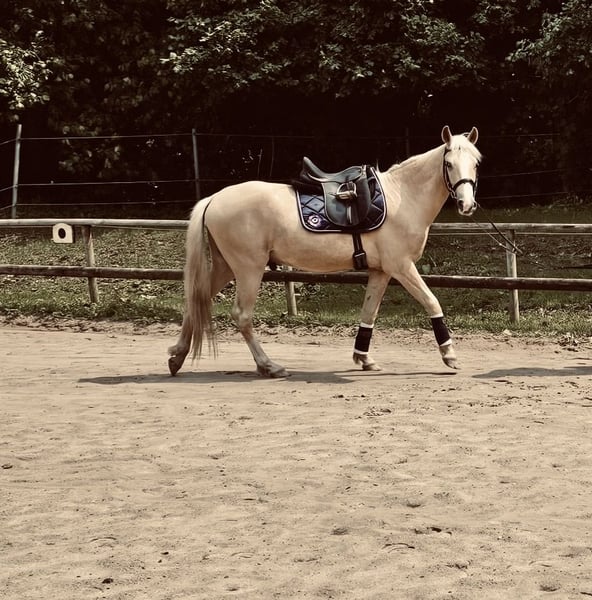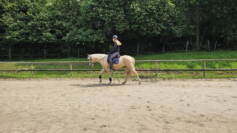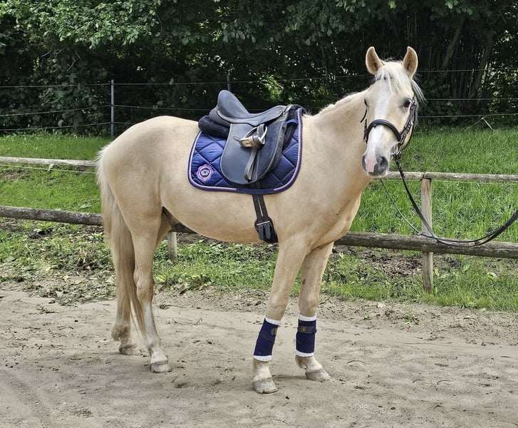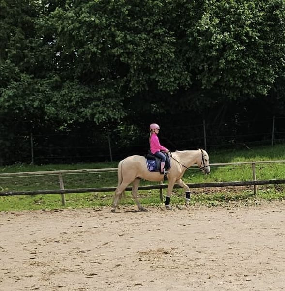 Krimi ist ein vier Jähriger, 146cm großer Palomino-Ponywallach. Er ist super artig und lieb Im Umgang. Er ist super lernwillig und möchte immer gefallen. Er hat auch schon ein paar Sprünge gemeistert, daran hat er sehr viel Spaß! In der Dressur ist er super bemüht und freut sich neues zu lernen und auch im Gelände war er schon. Unter Aufsicht wurde er auch schon von Kindern geritten. Krimi steht bei uns in einer gemischten Herde und ist immer aufgeschlossen und freundlich zu Mensch und Tier! Er hat einen polnischen Pass und ist Influenza/ Tetanus geimpft sowie entwurmt. Wenn ihr ein wirklich tolles Pony sucht, dann meldet euch gerne! Für das Probereiten berechnen wir 25€, die selbstverständlich mit dem Kaufpreis verrechnet werden. Er wird im Auftrag verkauft