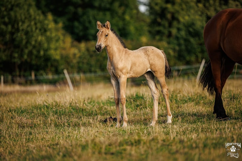 This strikingly beautiful Buckskin filly, born in June 2025, is the little sister of our exceptional Palomino mare and matches her in expression, presence, and movement strength. She impresses with her strong charisma, a bright, alert mind, and a very harmonious overall appearance – a confident little mare with plenty of charm. In movement, she demonstrates rhythm, impulsion, and correctness. Her gait is harmonious and well-balanced, which has been recognized and awarded by the breeding association. Due to her pedigree and the presence of the cream gene, she is registered as a Palomino. Her temperament is particularly noteworthy: attentive, brave, and cooperative, with quick comprehension and a positive work attitude. She approaches new situations with curiosity, remaining clear-headed and manageable – qualities that make her a pleasant and reliable partner under saddle. She comes from a proven bloodline: her dam is a Curly Horse mare, known for stress resistance and eagerness to learn. Her sire, Sölrings Cuvée, an approved performance stallion and breed champion, brings type, harmony, good basic gaits, and a balanced temperament – qualities he consistently passes on to his offspring. With an estimated final height of approximately 16.1 hands, she offers excellent potential for versatile use. She is suitable for breeding, ambitious leisure riders, or as a dependable family horse. We can also very well imagine her as a future therapy horse. She has been raised in a herd with her mother, relatives, and other young horses, developing secure social behavior early on. She moves confidently within the group, communicates respectfully and clearly – an important foundation for mental stability. In daily handling, she is people-oriented, straightforward, and eager to learn. She enjoys participating in everything, seeks contact, and wants to please people. This combination of character strength, inner calm, and motivation promises very pleasant riding qualities. This Buckskin mare combines correct movement, breeding quality, and a strong temperament. A harmonious young horse with potential for those who value character and a fair, thoughtful partner.