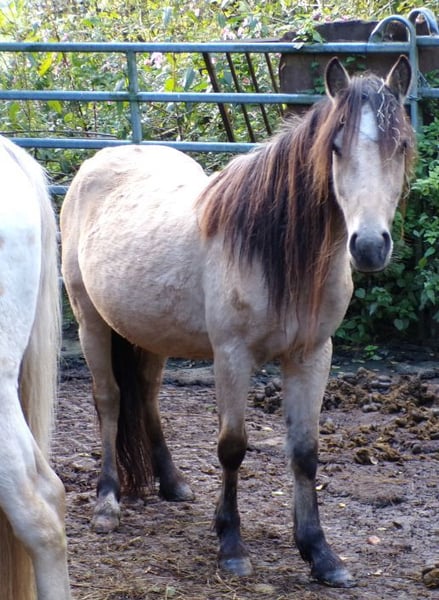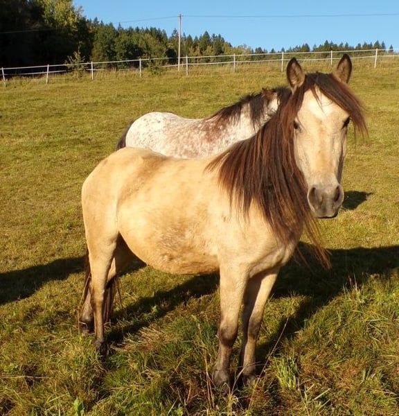 Bon Voyage, que nous appelons Trixie, est la fille d'une jument Tinker et d'un étalon Paso Fino. Malheureusement, elle est trop petite pour nous et cherche donc un joli foyer comme poney de conduite ou pour enfants. Elle est gentille et sans vices, mais plutôt timide envers les étrangers. Elle n'a pas encore été travaillée davantage, elle est donc seulement manipulée en licol. Elle a grandi dans un troupeau mixte en stabulation libre, où elle vit encore.