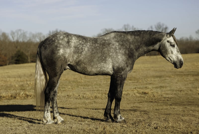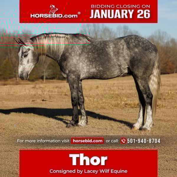 𝐉𝐀𝐍𝐔𝐀𝐑𝐘 ⭐️𝑨𝒍𝒍 𝑺𝒕𝒂𝒓 𝑳𝒊𝒏𝒆𝒖𝒑⭐️ Happening now thru MONDAY | JANUARY 26th - Available EXCLUSIVELY on HorseBid's website! For more details and to register visit: www.Horsebid.com CONSIGNOR CONTACT: Lacey Wilf Equine 501-940-8704 LOCATION: Quitman, AR BREED: Percheron x Andalusian REGISTERED: No REGISTERED NAME: THOR COLOR: Grey HEIGHT: 16.2 Hands AGE: 5 GENDER: Gelding Thor doesn’t arrive quietly. He enters with a bold presence and a calm authority that draws attention without asking for it. A 5 year old Percheron x Andalusian gelding standing 16.2 hands and weighing 1,350 pounds, he is built like a monument yet moves with the elasticity and polish of a much lighter horse. There is nothing ordinary about how he carries himself, or how he makes people stop and look twice. On the trail, Thor is thoughtful and steady, confidently navigating down timber, creeks, uneven footing, and changing terrain whether in a group setting or riding solo. He takes in traffic, fireworks, flags, tarps, and other unexpected situations with patience rather than urgency, staying present with his rider and moving forward with a relaxed, willing mindset. In the arena, he is fluent across disciplines, riding English or Western with equal ease, picking up both leads cleanly, offering a correct, powerful stop, and staying soft and responsive through his body. His natural balance, cadence, and presence point toward a serious future in dressage, while his scope and enthusiasm over fences make him equally compelling as a jumping prospect. Beyond the arena, Thor has experience at the stockyards and is accustomed to full days working cattle. He remains level-headed in busy environments, willing through long hours, and steady under pressure. He is also confidently broke to drive, harnessing quietly, standing patiently to be hitched, and working willingly in the lines with a consistent rhythm and attentive feel, whether on the road or in open spaces. What truly separates Thor is his character. He has a large, expressive personality and a genuine desire to engage with people. He seeks approval, enjoys interaction, and carries himself with a quiet pride that feels intentional rather than trained, forming partnerships quickly and naturally. On the ground, he is refreshingly straightforward. Easy to catch, groom, saddle, bridle, mount, haul, and load. He stands quietly and respectfully for the farrier. Thor pastures well with others and is equally content in a stall or a paddock. His manners are reliable, his routine uncomplicated, and his presence in the barn is calm and confident. Thor is not a horse that blends into the background or fits into a mold. He is substance with sophistication, power with refinement, and presence with purpose. A rare combination of size, talent, and mind, he offers far more than a standard ride, he offers an experience. Watch his full Youtube video, feel free to reach out with any questions, and arrange a visit or a FaceTime with Thor!