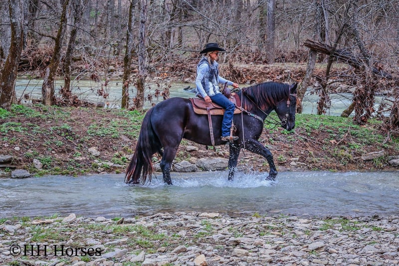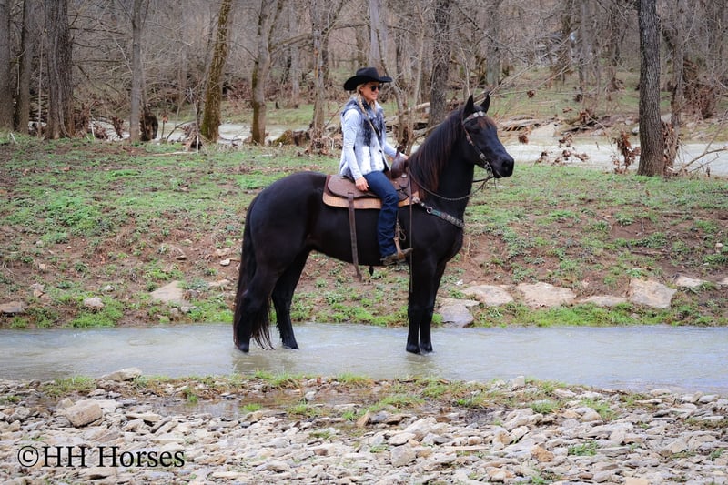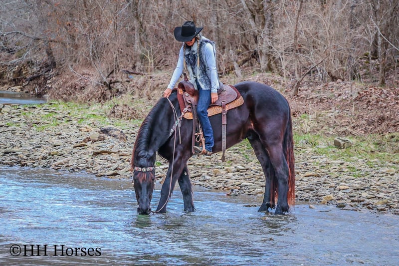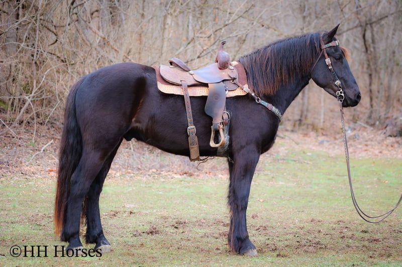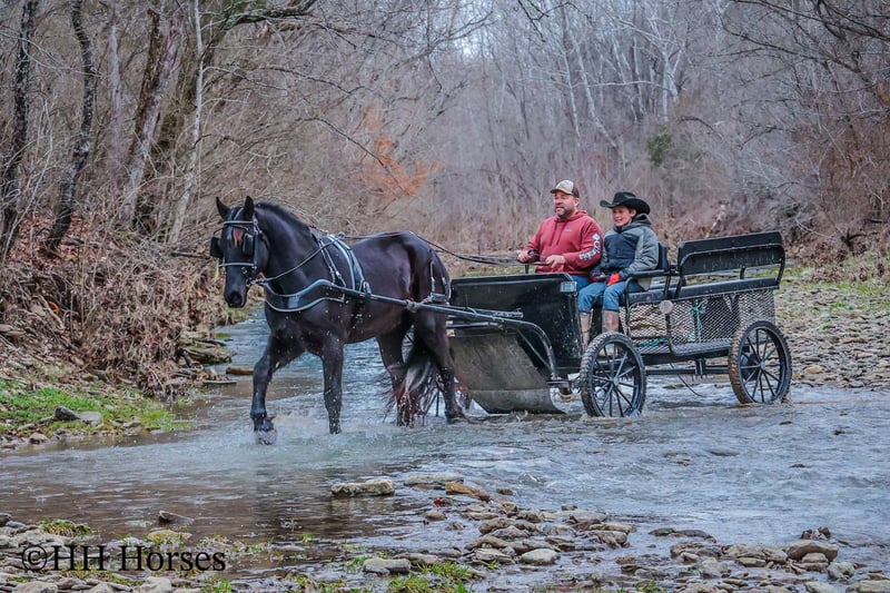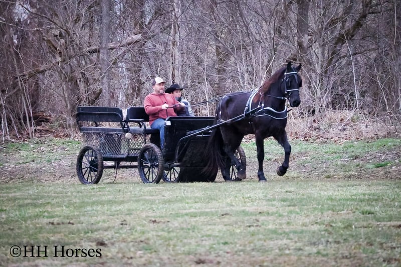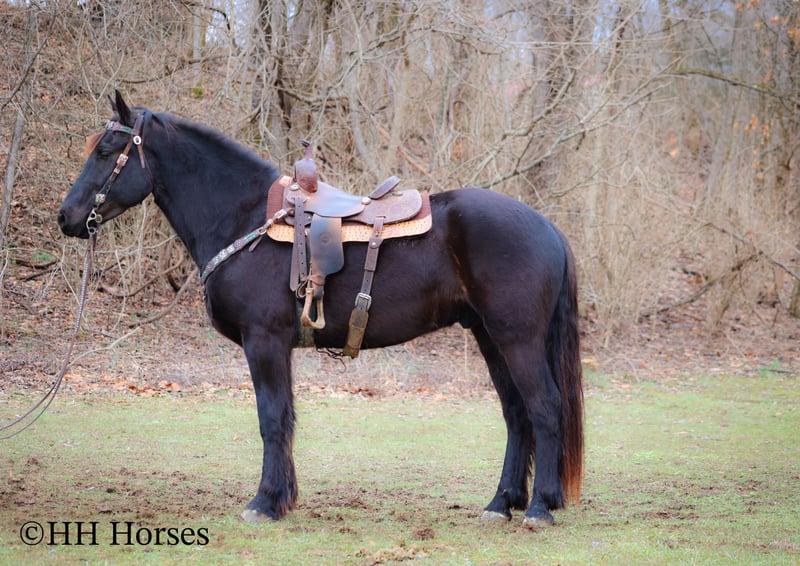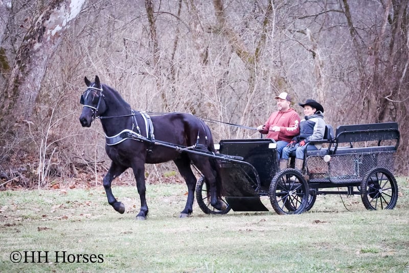 ONLINE AUCTION Place your bids at www.PlatinumEquineAuction.com Starting Bid $3500 Auction ends March 2nd, 2025 Need a new saddle? Check out White Rock Saddles on our website or Facebook! This is “MIDNIGHT THUNDER”, a fancy, intelligent, experienced, and friendly black FRIESIAN PERHCERON CROSSBRED GELDING. He is broke to ride and drive. He stands 16.1 hands tall and is 4 years old. He has been through the cross country driving courses and he has pulled a wagon, cart, and farm machinery. He has been trail ridden and will cross water quietly under harness or tack. He is quiet natured and will only go as fast as you ask of him. He has a big stop, he backs up, and moves off of leg cues. This gelding has been ridden English and Western in the indoor and outdoor arenas. He will lope nice circles, one step lope, and catch his leads. He has been ridden by youth riders with no issues. He is a horse that truly aims to please. He will ride out alone bravely or will travel peacefully in a group. He is confident, calm, collected, and cool when unloaded in new places. He has been in several holiday parades and is fine with lots of commotion, traffic, and noises. He is a very well mannered young Friesian gelding that wants to be good. He likes people, enjoys attention, and gets along well with all new horses he meets. He has been around skid steers, tractors, side by sides, and other heavy equipment. He is the hard to find kind with his ride, demeanor, training, and ability. He stands to harness, hitch, tack, mount, and groom. He stands for a mounting block and you can get on from either side of him. He will ride bareback and he has packed saddle bags. He is a nice horse that does not take advantage of timid riders. He is a great choice for anyone wanting a lifelong partner to bond with. He is easy to drive and comfortable and fun to ride. For more info or to make a Buy It Now offer contact HH Horses Erin 304-238-4155. Located in Flemingsburg, KY. ONLINE AUCTION Place your bids at www.PlatinumEquineAuction.com Starting Bid $3500 Auction ends March 2nd, 2025 Need a new saddle? Check out White Rock Saddles on our website or Facebook!