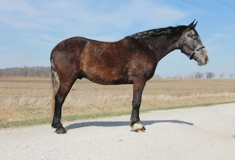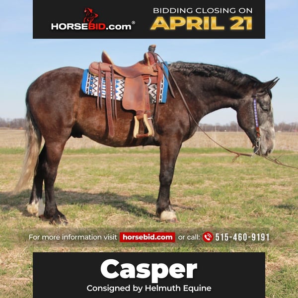 APRIL ALL STAR LINEUP ↞ 1923 Edition ↠ Happening now thru MONDAY | APRIL 21ST - Available EXCLUSIVELY on HorseBid's website! For more details and to register visit: www.Horsebid.com CONSIGNOR CONTACT: Helmuth Equine 515-460-9191 LOCATION: Ames, IA BREED: Percheron/Quarter Horse Cross REGISTERED: No COLOR: Gray HEIGHT: 15.2 AGE: 5 GENDER: Gelding Meet Casper, a 6 year old 15.2 hand gorgeous percheron quarter horse cross gelding that’s an absolute one of a kind. Casper is very well trained to ride and drive in almost every type of scenario. He’s the type of horse you can ride every day or once a month and he’s always willing to do whatever you want. He rides both English and western. He has nice enough movement for dressage or he can jog like a quarter horse. He would be a fantastic candidate for ranch horse shows because of his willingness to do anything you ask of him and he stays calm and quiet no matter where you take him. He will go down any trail, through water, up and down banks and hills, through town and even the drive-thru! He is truly safe enough for any amateur to ride or drive on any type of trail. We have used Casper to drive with young green horses in harness and he handles it like a champ. Casper is 100% sound and heathy in every way. He can happily live outside in a herd or in a stall with zero issues. He’s an easy keeper with excellent feet and no extra maintenance required. This special guy has been around the farm for some time now and has experienced almost everything we have to offer. He had the winter off and we just put him back to work and he acted like he never missed a day. Truly a sweetheart of a horse that will win your heart! He currently has his winter coat but as you can see when he sheds off he’s an absolute stunning grey that you can’t take your eyes off.