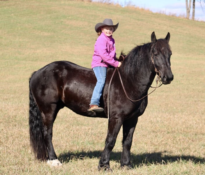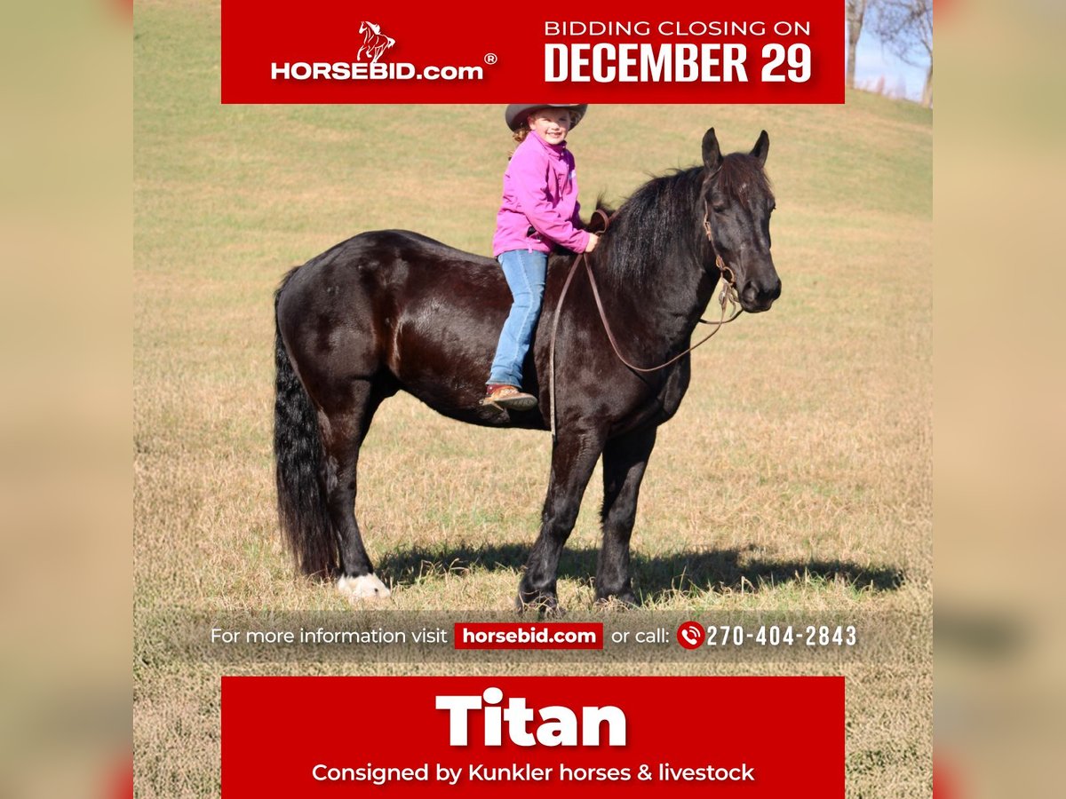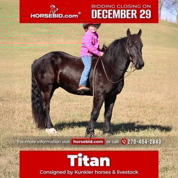 ⚜️𝐓𝐇𝐄 𝓗𝓮𝓻𝓲𝓽𝓪𝓰𝓮 𝐖𝐢𝐧𝐭𝐞𝐫 𝓒𝓵𝓪𝓼𝓼𝓲𝓬⚜️ Happening now thru MONDAY | DECEMBER 29th - Available EXCLUSIVELY on HorseBid's website! For more details and to register visit: www.Horsebid.com CONSIGNOR CONTACT: Kunkler horses & livestock 270-404-2843 LOCATION: Tompkinsville, KY BREED: Percheron / AQHA REGISTERED: No REGISTERED NAME: Titan COLOR: Black HEIGHT: 16 AGE: 6 GENDER: Gelding Titan is an outstanding draft cross gelding with tons of shape and size. Titan is down-to-earth and gentle! Titan has seen many miles of trails and had a lot of outside riding; he’s been ridden indoors as well! Titan crosses creeks, logs, tarps, etc., with ease! If you’ve been searching for a great horse to take care of you, he’s your man. Titan takes both leads with ease, and you don’t have to be a pro to ride him; he stands to pick up all of his hooves without an issue! Titan stands for baths and to mount as well as dismount. Titan not only rides very well, but he drives just as well! Anyone can drive Titan; he’s traffic safe, he’s been exposed to all aspects of livestock, and he isn’t bothered by dogs! Titan has been in parades and large groups; he will ride anywhere you ask him to! Don’t miss this amazing boy; he’s the works!