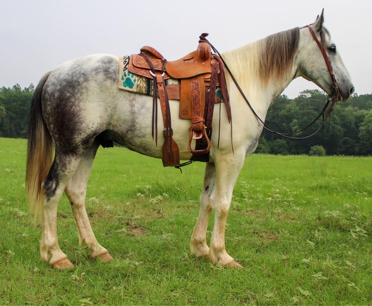 ONLINE AUCTION Place your bids at www.PlatinumEquineAuction.com Starting Bid $3500 Auction ends June 9th, 2024 Need a new saddle? Check out White Rock Saddles on our website or Facebook! Meet Concho, a gentle and affectionate crossbred gelding that will capture hearts wherever he goes! Whether you’re hitting the trails or setting up camp in the hunting grounds, Concho is guaranteed to turn heads. Concho is 8 years old stands at 16.hh and wears a size 4 shoe. He is a absolutely beautiful grey and white paint and has the feathers and bone of a true crossbred! Concho boasts a smooth trot and lope, ensuring a delightful ride all day long. He’s a true gentleman under the saddle, seamlessly opening and closing gates. This solid ranch gelding is versatile, whether you’re dragging calves in the branding pen or embarking on a cattle-doctoring adventure during your next big loop. This surefooted and mild-mannered gelding is not only easy to handle but also makes for the perfect companion on hunting expeditions and pack-in camping trips. He has extensive experience in hunting camps, Concho excels in packing out game and leading a pack-string with ease. Navigating mountains is second nature to Concho, making him an exceptional trail horse. His calm demeanor, sure footing, and easygoing nature make him a joy to ride on any trail. Additionally, Concho shines in the arena, displaying softness, flexibility, and an impressive stop. No matter your equestrian pursuits, Concho is the horse for you. Whether you’re seeking a reliable ranch companion or a stylish performer in the arena, Concho is the epitome of a versatile and well-loved gelding. Don’t miss the chance to bring this exceptional horse into your barn he truly is a favorite that suits riders of all levels! Call or text TR Livestock Rachel 605-370-4644 for more info! Located in Rusk, TX. ONLINE AUCTION Place your bids at www.PlatinumEquineAuction.com Starting Bid $3500 Auction ends June 9th, 2024 Need a new saddle? Check out White Rock Saddles on our website or Facebook!