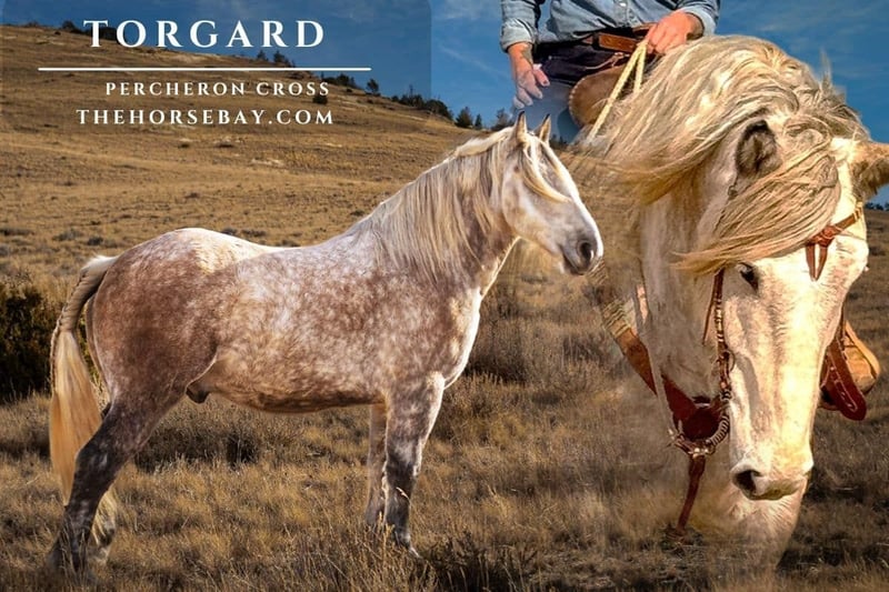 Tiny Pony Co. proudly offers Torgard. This gelding is a stunning and unique rose grey dapple, Old-World built Percheron Quarter Horse Cross. He is 6 years old and stands an impressive 16.2h. Torgard lives up to his name, which means “protected by thunder”. He has the presence of a war horse with the heart of a best friend. He has been a part of our program (and our family), since early last summer – we have grown to know him well and love him immensely. He has proven to be a calm, confident and kind horse. He thrives on deep connection and is what we refer to as a “people horse” – he prefers to spend time in community with his humans. Torgard has more personality than a lot of folks we know. He is pure entertainment, very cheeky and playful – he will steal the gloves from your pocket, the hat off your head or the flag during training (see video!) His playfulness is nicely balanced with soft, snuggly moments – making him that much more lovable. On the ground, Torgard has learned to be respectful of his leader’s personal space. He will stand tied (often napping) all day. He also ground ties nicely. He loves attention – lengthy grooming sessions take him right to his happy place. Torgard thoroughly enjoys working at liberty and is content to just hang out with his people – no lead rope required. In the saddle, Torgard feels gentle yet confident – as though he understands the importance of protecting his rider. He walks with purpose and pride. His gaits are very smooth for a gelding of his size, and he is soft in the ribcage, moving around nicely for a horse of his stature. He is a comfortable ride, picks up the correct lead, side passes, and stops nicely off the seat and “woah”. He isn’t heavy in the bridle and moves well off of leg pressure. He has the strength and stamina to easily carry any rider on an all day adventure. He is the same horse every day you pull him out to work – he puts his head right in the halter, ready to spend time with you – any way you’d like. Take this one anywhere and any which way you want – we believe he was born to hit the trails and that he would excel as a backcountry hunting mount, pack horse or even a mounted patrol horse. He is brave, sure footed, patiently stands rein on mane and loves being out in nature. He will also stand calmly to be mounted from the ground, a rock, a log and yes, even the scary mounting block! He is both willing and a quick study. Torgard can be kept out in a herd or in a stall with no trouble. He has proven to be middle to low end of the pecking order out on pasture. He loads and unloads from the trailer with ease. As much patience as this sweet horse has, when it comes to getting a trim from the farrier, he requires a little help and understanding. He is never rude and has shown great progress in this area with each trim!