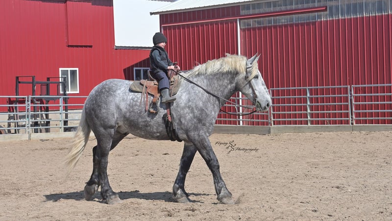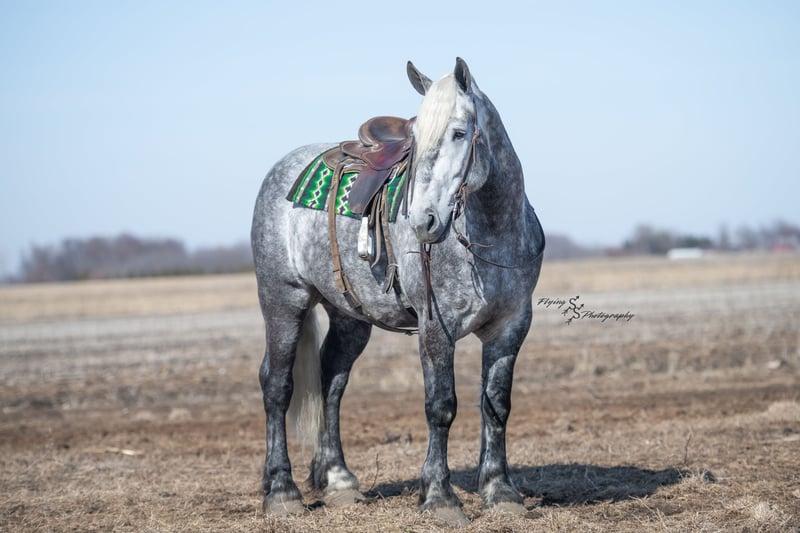 ONLINE AUCTION Place your bids at www.PlatinumEquineAuction.com Starting Bid $3500 Auction ends April 20th, 2025 Need a new saddle? Check out White Rock Saddles on our website or Facebook! Winston is a handsome dapple gray, 6 year old, registered percheron gelding. Our favorite thing about Winston is that he is incredibly safe. The phrase “Safety First” could quite literally be used as his slogan. Winston is a gentle giant, standing a staggering 18.1h tall! He will happily stand at a mounting block, or let you mount from a fence. Do not let Winson’s size intimidate you, he is a joy to handle, even for children! He is a blast to take out on the trails, easily stepping over down timber, crossing water, and going whatever direction you point him in. Winston is perfect for riders of any age and any level of experience. He is very honest on the ground as well as under saddle, admirably taking care of his rider, allowing you to place all of your trust in him. Winston rides western and bareback, bridled and bridleless, and is as comfortable under harness as he is under saddle. He drives absolute best and is incredibly safe, even for beginners or kids. Winston is easy to catch, saddle, bridle, bathe, shoe (easily picks up all 4 feet), and groom. He does great in a stall, as well as in a pasture with other horses. He rides around in an open field just as honest as he does in an arena. He is absolutely traffic safe, and is unphased by anything you will see riding down main street or a highway on a busy evening. Winston will lope in the correct lead, has a nice stop, stands quietly when cracking a bull whip or shooting a pistol, will walk through all of the obstacles, and stays solid even with time off. He is a great fit for the whole family. Winston is even loved by the farm dogs, who he will also allow to ride him! It is impossible to list everything we love about this gentle giant because the list is endless. He is truly a once in a lifetime gelding that we are proud to offer! Winston is current on Coggins, and also has a PPE on file. If you have any questions, or would like to meet him prior to the auction ending, please call Edwin Raber at 319-283-0616. Located in Fairbank, Iowa ONLINE AUCTION Place your bids at www.PlatinumEquineAuction.com Starting Bid $3500 Auction ends April 20th, 2025 Need a new saddle? Check out White Rock Saddles on our website or Facebook!