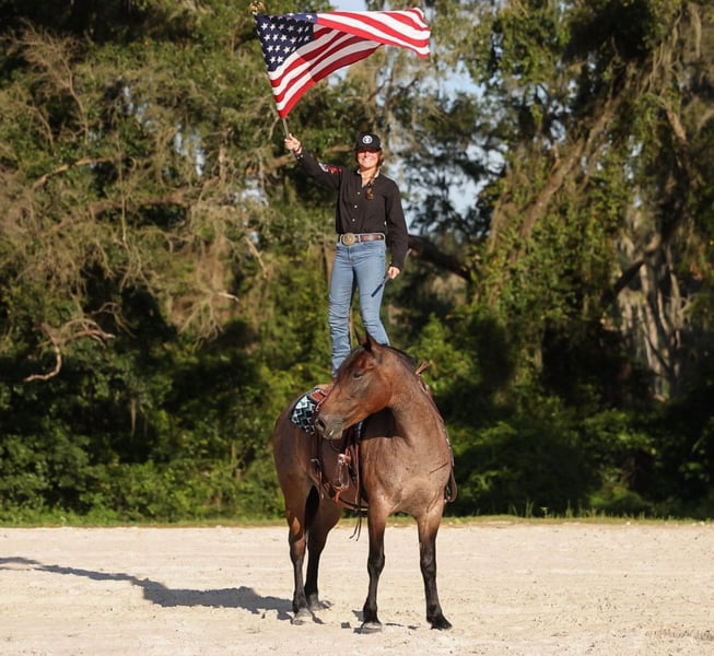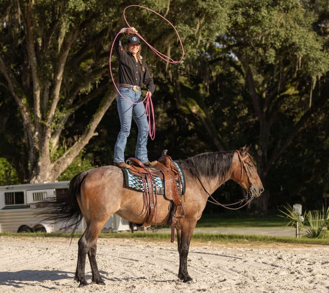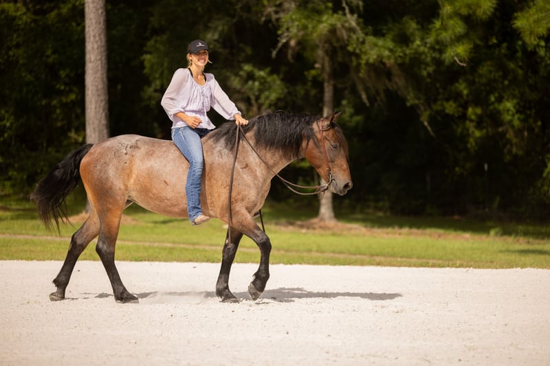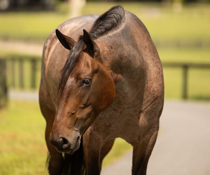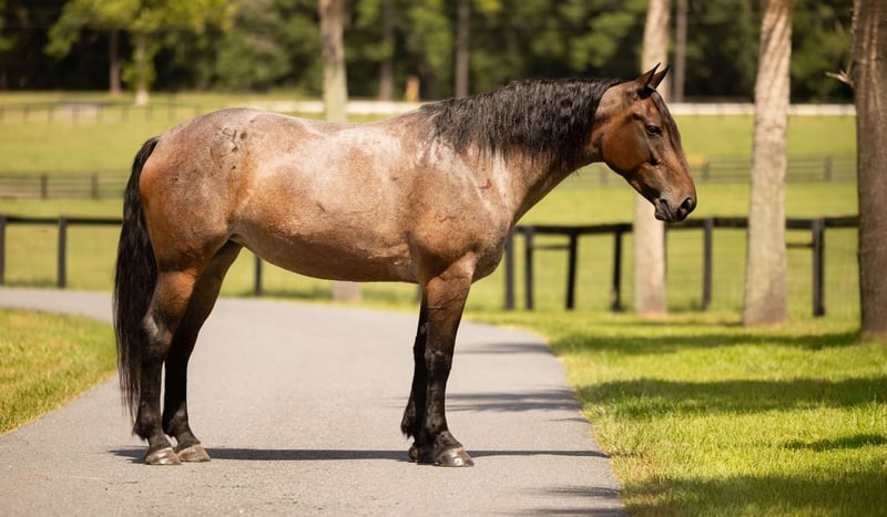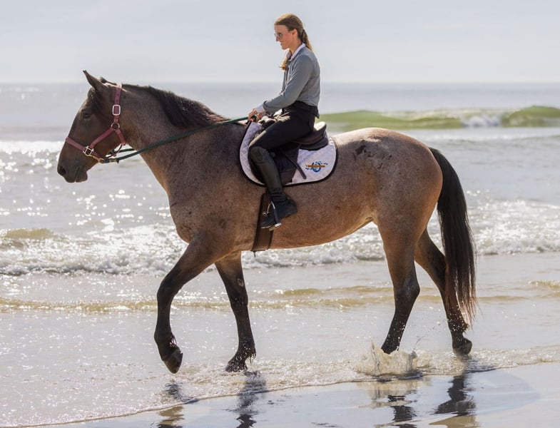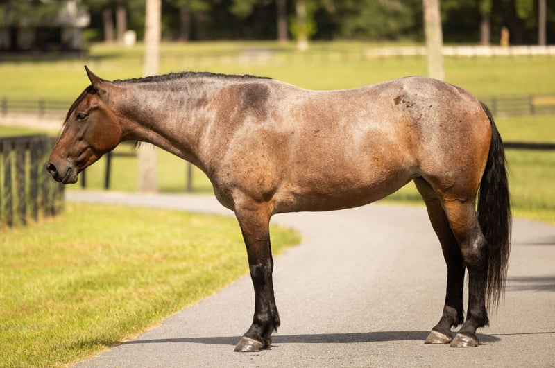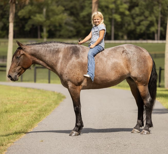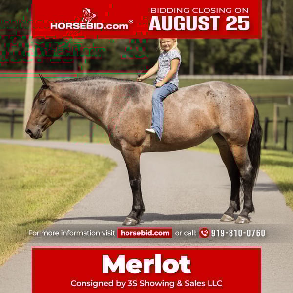 ⭐️ 𝐀𝐔𝐆𝐔𝐒𝐓 𝓐𝓵𝓵 𝓢𝓽𝓪𝓻 𝓛𝓲𝓷𝓮𝓾𝓹 ⭐️ Happening now thru MONDAY | AUGUST 25th - Available EXCLUSIVELY on HorseBid's website! For more details and to register visit: www.Horsebid.com CONSIGNOR CONTACT: 3S Showing & Sales LLC 919-810-0760 LOCATION: Ocala FL BREED: Percheron x Quarter Horse REGISTERED: No COLOR: Bay roan HEIGHT: 15.2 AGE: 4 GENDER: Mare Merlot aka “Millie” is truly a once-in-a-lifetime mare—the kind of horse people spend years searching for, yet many never find. A stunning Percheron x Quarter Horse cross, she embodies steadiness, kindness, beauty, and proven reliability in every environment. At just four years old, she carries herself with the maturity and calm of a seasoned veteran, making her suitable for nearly any rider. Proudly bearing our rare and prestigious #ELITE 3S certification, Merlot has been thoroughly trained, tested, and trusted to meet the highest standards of safety, versatility, and trainability. She’s been ridden by children, beginners, seniors, and nervous adults alike, excelling in settings ranging from trail rides to obstacle courses, beach outings, and even the busy streets of Downtown Ocala. She walks, trots, and canters with smooth, balanced gaits, jumps confidently, schools cross-country, and responds to voice cues and light aids with grace and forgiveness. More “woah” than “go,” she remains soft off the leg, always willing, and incredibly responsive. She truly is a “do it all” type of girl. She has taught many children how to ride and has even been a horse for the kids to do their very first lope/canter on. Merlot is exceptionally desensitized to the world around her—unbothered by traffic, sirens, bikes, dogs, tractors, tarps, ropes, and more. She’s been ridden in everything from a halter and lead rope, carries a flag proudly, and remains calm and connected through it all. On the ground, she’s equally impressive: She loads easily, ties, cross ties and on ground ties. Millie bathes, clips, stands perfectly for the farrier, and simply loves attention—especially from children. Millie will sink her head into your chest for snuggles. I could go on and on about Millie, but whatever I write about her truly wouldn’t to her justice. Millie is just an extraordinary mare. I don’t say this lightly when I say, she is the most well minded horse I’ve ever had in our barn. A sound, vice-free, easy keeper, she is the true definition of a barn favorite. We trust her completely, and she has earned that trust in every way. Whether you’re a first-time rider, a nervous re-rider, a family looking for the perfect all-around horse, or an instructor seeking a rock-solid addition to a lesson program, Merlot fits the bill. She’s safe, fun, no-maintenance, and incredibly consistent—ride her every day or once a month, and she’ll be exactly the same. Letting her go won’t be easy, but we stand behind this mare fully and know she’ll bring her next home the same joy she’s brought to us. Just like people get health insurance for peace of mind, buying a well-trained, well-prepared horse is an investment in your own safety and enjoyment. Give yourself the best chance at success by purchasing an #ELITE #3S horse. Merlot “Millie” is your insurance policy.