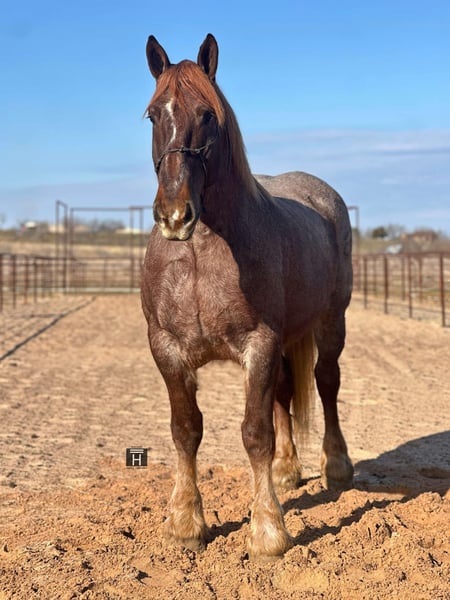 ONLINE AUCTION Place your bids at www.PlatinumEquineAuction.com Starting Bid $3500 Auction ends February 3rd, 2025 Need a new saddle? Check out White Rock Saddles on our website or Facebook! Merlot is a beautiful red roan mare standing 16.2 hands tall with enough mass to pull a house down. We normally call horses like her the perfect beer drinking horse but this mare is so classy we call her a wine drinking horse. Merlot is a sweet mare that is gentle and kind. She lowers her head to be haltered and bridled. She saddles up like a lady every day and is the perfect mount to jump on and go down the trails, or hook up and drive to town. She will cross all the obstacles we have found including water, logs, brush, and mud and will go up and down even the toughest of terrain with sure footedness. She will lead, follow, or go out on her own. She loads and unloads with ease and stands tied. Merlot will stand at the mounting block, cross tie, and is good stalled or turned out. We have never seen her show any mare tendencies. She is barefoot and sound with clean/straight legs. She is a stunning mare with chrome and mass that you have to see in person to appreciate! FMI call/text Holland Horse Co Chanel 559-978-6320. We are happy to answer questions, schedule a test ride, or help arrange shipping nationwide! Located in Jacksboro, TX. ONLINE AUCTION Place your bids at www.PlatinumEquineAuction.com Starting Bid $3500 Auction ends February 3rd, 2025 Need a new saddle? Check out White Rock Saddles on our website or Facebook!