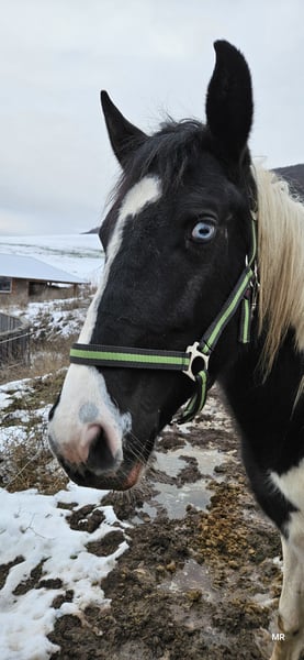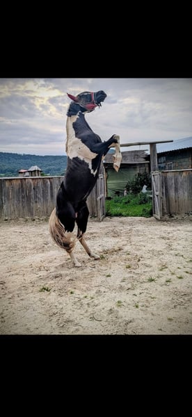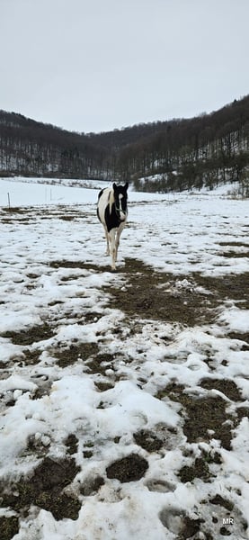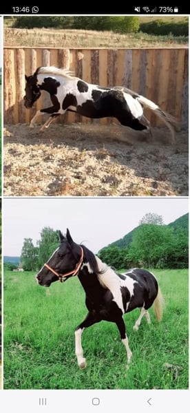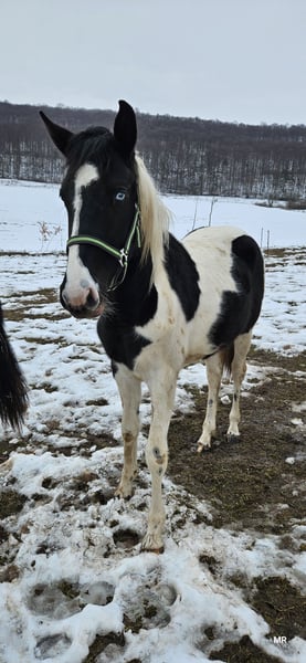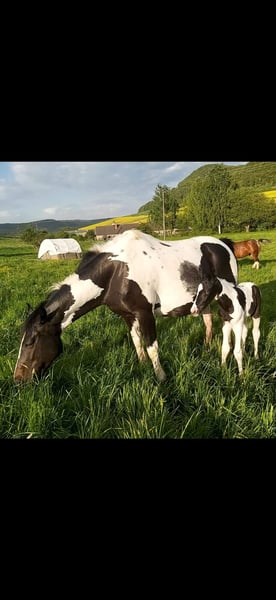 Unfortunately, we are offering our wonderful yearling mare for sale due to personal reasons. Name: Harley Mirage Date of Birth: May 2, 2024 Approximate Height: 15.5 hh Breed: Paint x Pinto Harley is a very lovely and eager-to-learn mare. She is familiar with basic foal training and has been regularly handled by the farrier in an exemplary manner. She knows how to go for walks and is confident enough to leave the herd. Her fencing is secure, and vet visits pose no problem. She is vaccinated, microchipped, and holds a green passport. She currently lives outdoors 24/7 with her siblings and two geldings. Introducing new horses to her herd is no issue at all. During the winter, she is also stabled. Harley is very friendly and allows herself to be groomed and touched everywhere. She has been bathed once in the summer. She is very robust, has never been ill, and has grown up in a herd environment, where she still lives. Her siblings and parents are nearby. Harley has a striking blue eye, which gives her a very charming appearance. She has a beautiful tobiano coat pattern and an even more loving personality. She is familiar with all farm animals (cattle, chickens, sheep, dogs, donkeys, etc.) and is used to being cuddled by children. She is always gentle and approaches the world with trust. She has not experienced anything negative. She is accustomed to road traffic and was often led on rides as a foal. Her sire is Tash King Jack, a 6-panel n/n tested Paint stallion. Her dam is a lovely pintaloosa mare. Harley herself is a tobiano.