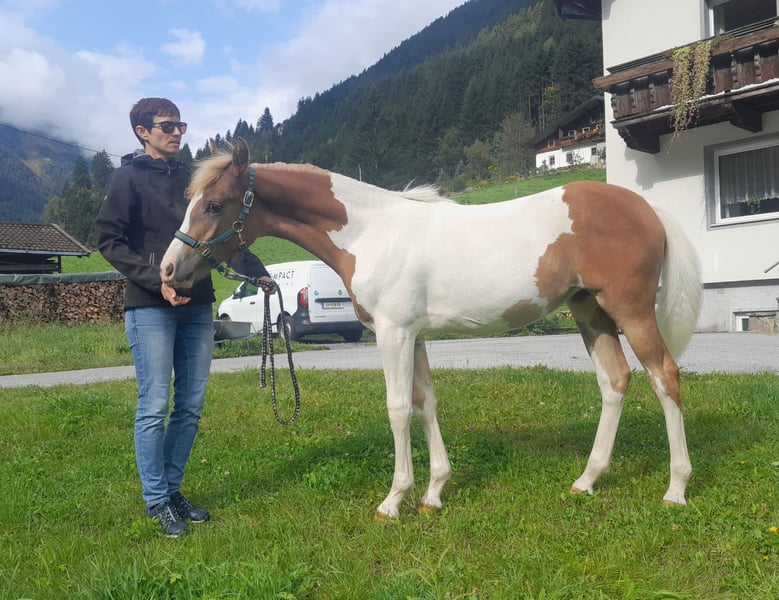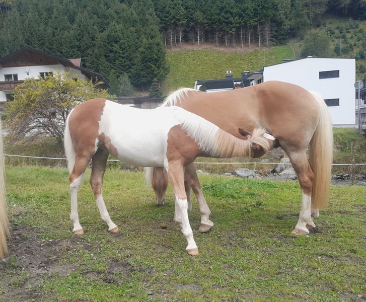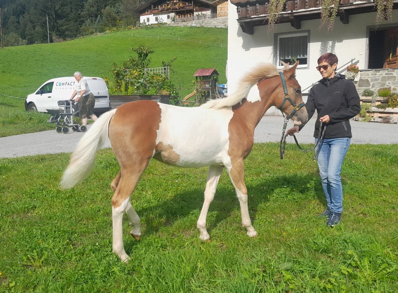 Malou will be the perfect leisure partner. Those looking for something special will find a dream horse in her unique coloring. Malou will be over 155 cm tall, knows the basics of foal training, is accustomed to traffic, trailers, farriers, washing, tying, and everything else possible. Malou is affectionate, smart, eager to learn, attached, brave, courageous, and up for anything. Vaccinated, microchipped, with passport. Mother: Mali, Tyrolean Haflinger mare Father: Jameel, Pinto Arabian 73.44% Ox