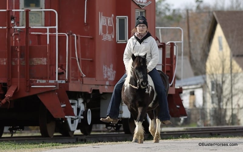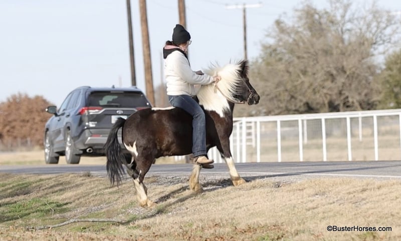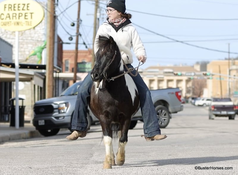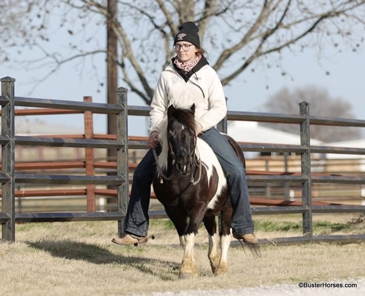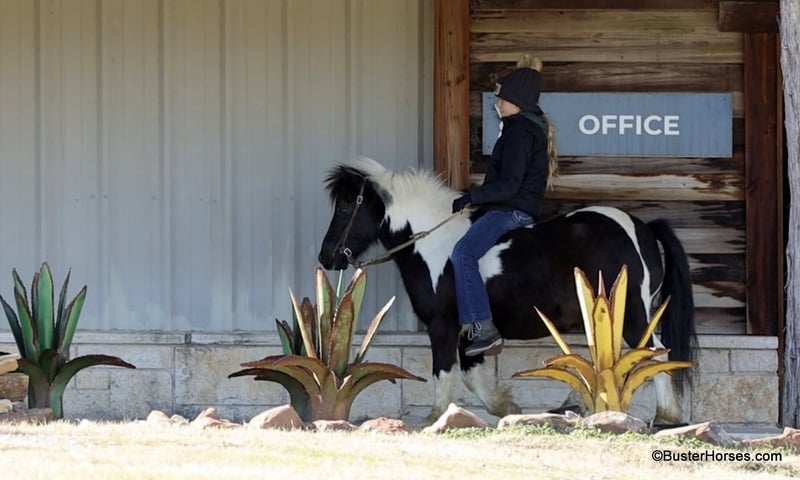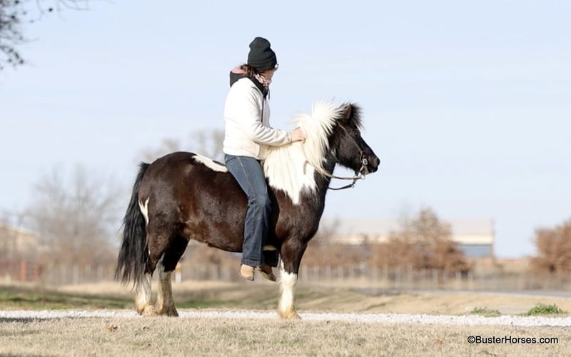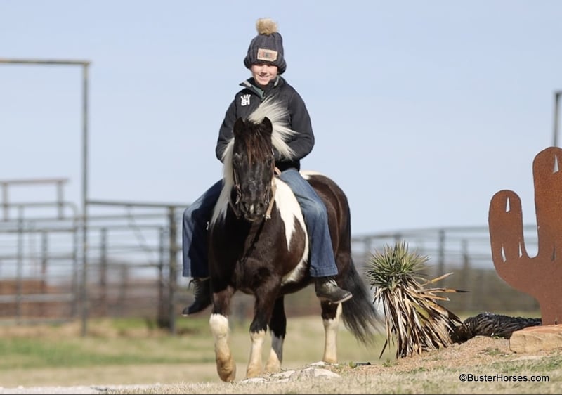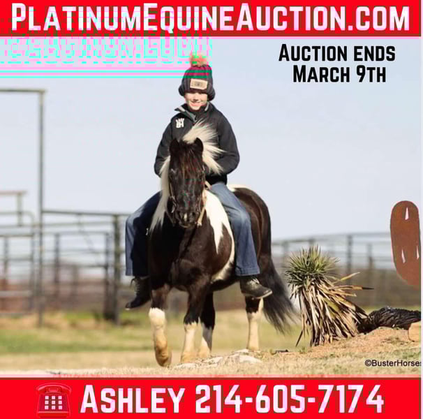 ONLINE AUCTION Place your bids at www.PlatinumEquineAuction.com Starting Bid $3500 Auction ends March 9th, 2025 Need a new saddle? Check out White Rock Saddles on our website or Facebook! Orca is the most peaceful, gentle, and the STOUT-EST little 11 hand pony that you can find! He is literally about as wide as he is tall! Whether you are only 1 …or you are 91, you can enjoy this pony! Heis plenty big and thick made enough for the bigger kids and the smaller adults to hop on and enjoy a ride. He will peacefully walk absolutely all day long, on a big loose drapey rain and he guides anywhere that you want to go easily. He is in no hurry to go anywhere and is suitable for any level of little rider. We got this special pony directly from the Amish family who raised him, and he raised an entire herd of their little kiddos. Because of his naturally laid-back and in no hurry to go anywhere demeanor, he was the very first one that the little bitties rode. He is only 10 years old and could be able to be in your family for a couple of sets of little ones, while still being incredibly seasoned for his young age! He is an exceptionally easy keeper – he will cost less to feed than most of your family dogs do! He adores babies and little tiny kids and enjoys lots of loving, brushing, and attention! He will peacefully stand with his head down and just take a nap – if that’s what the situation calls for! He is exceptionally good riding down the side of the highway and riding into town around and in traffic. He hops right on the trailer like a seasoned old gentleman, and he is extremely easy to saddle, bridle, and will stand next to anything quietly while you climb on! He happily crosses water, and will ride anywhere you want him to in a group of horses, or he is also extremely comfortable and quiet and relaxed riding out all alone. Zero issues worrying about the barn or leaving his buddies. He is super cozy and easy to ride bareback, we have thrown a halter on him and swung up on him many times. Most all of the time the kids just grab him and ride bareback because he is so wide and cozy to sit on! He is great with time off and one of those rare ponies that you can leave out for 2 months and just go grab and use him and he’s the same pony. He is one of the special ones that stays relaxed, civilized, and broke – and doesn’t turn into a silly boy if you leave him turned out for a while. Please feel free to call us anytime if you have any questions about Orca, Buster Horses Ashley 214-605-7174 Orca is barefoot and has excellent feet, his teeth were just done by our equine dentist last month, his feet were just trimmed this week, and he also was dewormed at that time. He is in great shape, definitely a whole lot on the fat side (his side blubber is where he got his name!) He is an easy keeper and in good health. Watch his video, and to see additional videos, go to our website: BusterHorses.com or our Facebook page Buster Horses. ONLINE AUCTION Place your bids at www.PlatinumEquineAuction.com Starting Bid $3500 Auction ends March 9th, 2025 Need a new saddle? Check out White Rock Saddles on our website or Facebook!