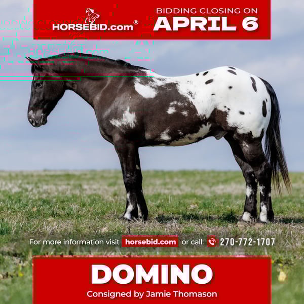 🌟𝑨𝒑𝒓𝒊𝒍 𝐀𝐋𝐋 𝐒𝐓𝐀𝐑 𝐋𝐈𝐍𝐄𝐔𝐏🌟 Happening now thru MONDAY | APRIL 6th - Available EXCLUSIVELY on HorseBid's website! For more details and to register visit: www.Horsebid.com CONSIGNOR CONTACT: Jamie Thomason 270-772-1707 LOCATION: Auburn, KY BREED: POA/Percheron Cross REGISTERED: No COLOR: Bay/White Blanket HEIGHT: 14.1 AGE: 5 GENDER: Gelding Make a statement with DOMINO! He’s unique and eye-catching! A 5-year-old POA/Percheron cross gelding, standing 14.1 hands. He offers a sturdy build paired with a fun and upbeat disposition. Domino has been put to work at the stockyard penning and sorting cattle, as well as gathering and sorting on the farm alongside stock dogs. Opens and closes gates with ease, and is no stranger to a days work. Out on the trail, he’s a confident, point-and-go type that has been enjoyed by my daughter. He is sure-footed and dependable, he navigates uneven, rocky terrain without hesitation, crosses deep water, bridges, and travels up and down inclines. Nothing seems to phase him, he carries the flag, unbothered by the tarp, and is comfortable around ATVs, UTVs, farm equipment, dogs, and other livestock. Domino has a friendly personality and is always easy to catch. He loads and hauls without issue, can be stalled or live outside, and fits nicely into a mixed herd. With great feet, he’s currently barefoot and maintained on a regular trim schedule. From the farm to the trail, Domino is a solid, dependable partner that’s ready to go in any direction. If you want a handsome, capable gelding that will get you noticed while staying safe, this is your guy. Domino sells current on all cares. If you have any other questions or would like to meet Domino, feel free to reach out! PPE’s welcome & we can assist in arranging transportation to anywhere!