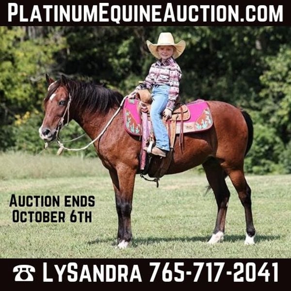 ONLINE AUCTION Place your bids at www.PlatinumEquineAuction.com Starting Bid $3500 Auction ends October 6th, 2024 Need a new saddle? Check out White Rock Saddles on our website or Facebook! Azule is a stout built beautiful Bay Gelding that is standing 13.1hh and he is a 6 year old. Azule is a do it all kind of horse! The kids have ridden him out on the ranch and pushed cows through some of the roughest terrain that you will see. He is very sure footed and takes care of his rider! He can go out and hit the trails and just cruise along slow and easy. He rides with his head low and lopes perfect circles, has a great stop and reins around good as well. He would go english and can jump as well. He has been exposed to all kinds of wildlife. He will go up or down steep slopes, across deep creeks, over downed trees, and over all types of rough terrain while still being sure footed. He has been ridden through town and is safe in traffic is not spooky. He has a smooth jog, a VERY VERY nice easy to set lope! Azule is an excellent horse for anything from trail to ranch work and is pleasure to be around! He is the horse that is stout enought to carry an adult and gentle enought to carry the kiddos!! We are located in Brodhead, KY. Feel free to call Lucky 13 Equine Lysandra 765-717-2041 with any questions. ONLINE AUCTION Place your bids at www.PlatinumEquineAuction.com Starting Bid $3500 Auction ends October 6th, 2024 Need a new saddle? Check out White Rock Saddles on our website or Facebook!