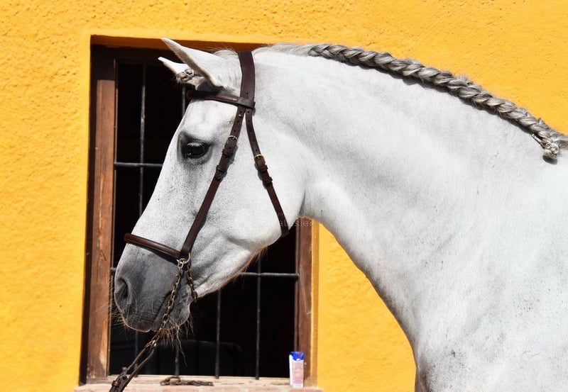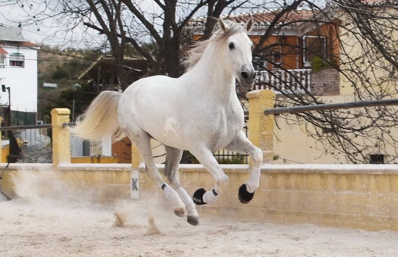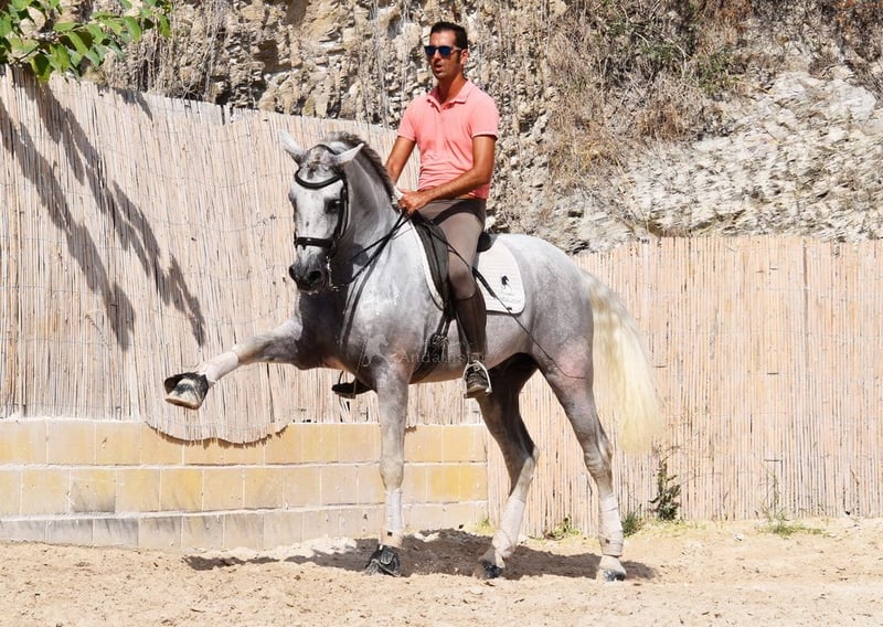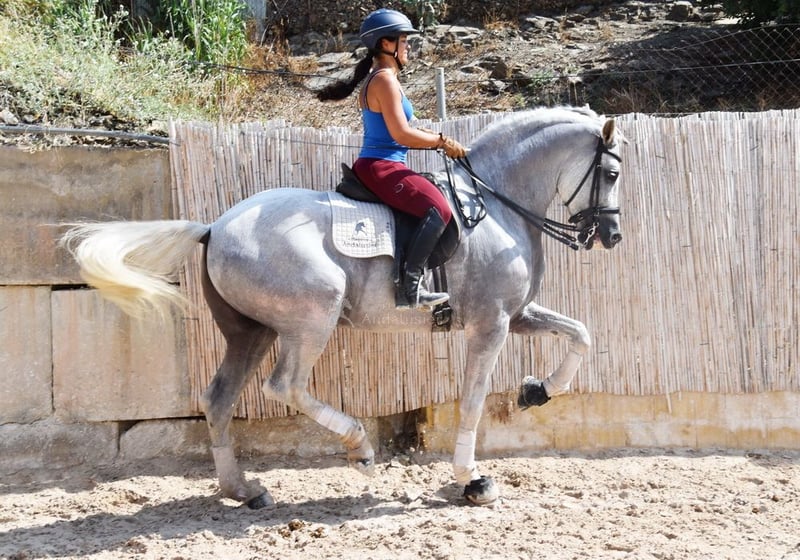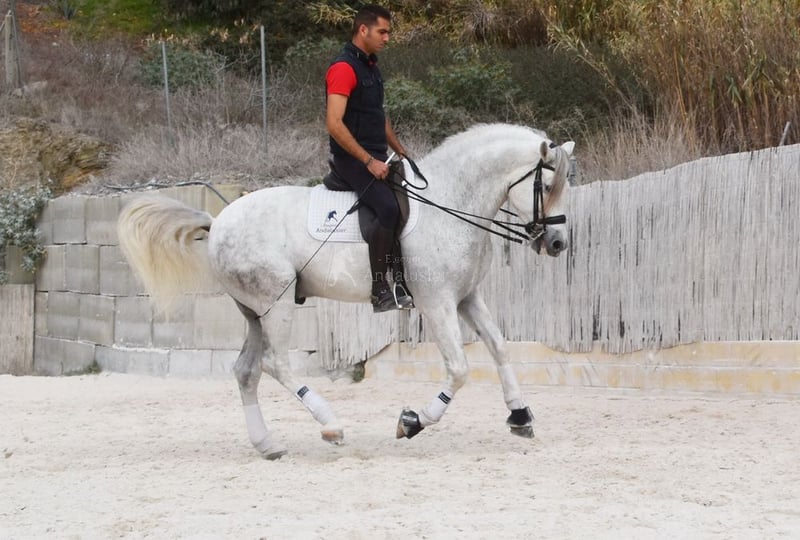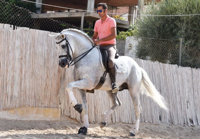 dear character with pleasant temperament, middle trot, lateral gaits, backward straightening, outside canter, gallop pirouettes, flying gallop changes, Spanish step, piaffe, passage, terrain, large, baroque, good pedigree, already has X-ray and is Piro negative, pedigree: Yeguada Militar, Yeguada Quintanilla, Lovera, San Roman, Grandpa Lobito IV and great-grandpa Fatuo de Nadales are qualified www.elegante-andalusier.com