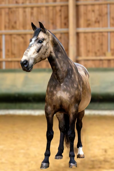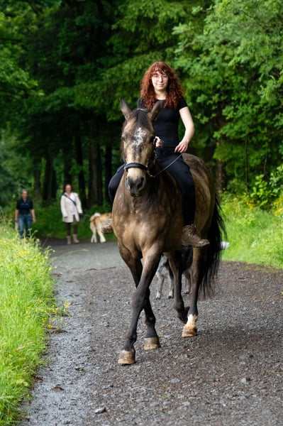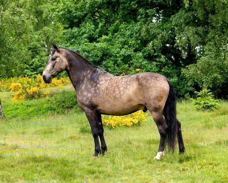 Our 2014-born PRE gelding impresses not only with his rare color but also with his friendly and honest nature. As a versatile leisure horse, he is an ideal companion. He is well-balanced, obedient, and steady-nerved both on the ground and under saddle. He is ridden casually in all gaits, sits softly, and is light in the mouth. He is familiar with classical lateral movements and initial working equitation obstacles, and he enjoys demonstrating the Spanish walk. We work extensively on the ground with him—lunging, in-hand, with poles, and free. His training is still developing, as he tends to want to please. He loves going out on trail rides; he is fearless, reliable, and always manageable. He is accustomed to dogs, joggers, wheelchairs, and bicycles. He handles everything alone or in a group. Although compactly built, he is not a weight carrier due to his breed. Currently, he is in a mixed herd at an active stable and shows himself to be very social. He has been regularly vaccinated, dewormed, and had his teeth checked. As a gelding, he is uncomplicated for farrier visits, and he is free of eczema and piroplasmosis. Since he is not suited for 24/7 pasture turnout, we are looking for a new home with an active or open stable that offers plenty of movement and enrichment.