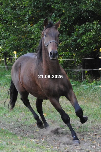 Oro Hell hatte als Fohlen eine Fehlstellung (das rechte Vorderbein war verdreht, da er im Mutterleib wohl nicht optimal gelegen hat und er wurde damit geboren) im rechten Vorderbein im Bereich des Karpalgelenks abwärts, die zwar behoben ist, eine minimale Fehlstellung im Bereich des Fesselgelenks haben wir bisher durch regelmäßige Hufbearbeitung im Griff. Wir haben uns die letzten zwei Jahre sehr intensiv um Oro gekümmert, er ist bei uns geboren ist und daher hatten wir die Verantwortung, ihn einen guten Start ins Leben zu ermöglichen. Das scheint uns auch gut gelungen zu sein. Er ist lahmfrei und läuft frei und fröhlich über die Weide und auch im Roundpen läuft er klar. Wir können dennoch nicht einschätzen, wie belastbar er in Zukunft sein wird. Aus diesem Grund verkaufen wir ihn ausdrücklich als Freizeitpartner. Röntgenbilder von 09/2023 sind vorhanden, damals wurden keine Auffälligkeiten festgestellt. • Aktuell ist Oro ca. 1,57 m groß mit seinen 2 Jahren. • Er ist sehr sozial und verträglich in der Herde • Hat spanische Papiere der ANCCE. • Er wurde im Oktober 2024 kastriert • Video vorhanden Oro stand mit seinem Kumpel 24/7 bis Anfang August auf der Sommerweide und aktuell läuft er zwischen unseren Stuten mit Fohlen, er ist ein toller Onkel für diese. Er kennt Offenstall, 24/7 Sommerweide als Jährling mit anderen Junghengsten und steht aktuell nachts in einer Box. Er ist altersgemäß erzogen, artig bei der Hufbearbeitung. Wir möchten für Oro gern einen Menschen finden, der seinen Schwerpunkt auf den Freizeitbereich oder rein auf die Bodenarbeit gelegt hat oder einfach einen tollen Partner fürs Leben sucht. Wenn Sie sich durch die Anzeige angesprochen fühlen und an Oro interessiert sind, melden Sie sich gern bei mir (idealerweise mit ein paar Worten zu sich). Er kann gern ganz unverbindlich besucht werden.