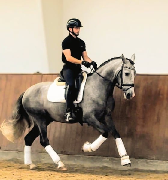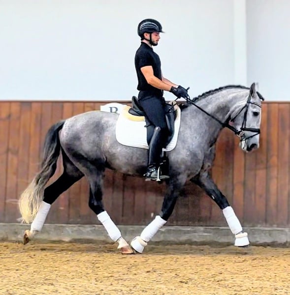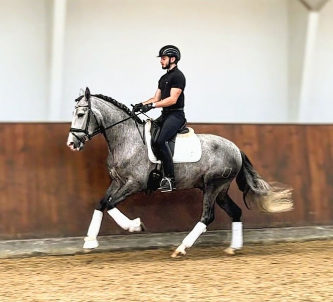Auf Papieren kann man nicht reiten, sagt man… aber die Papiere kann man diesem edlen Traumpferd ansehen. Der junge Wallach (bereits vor Ort kastriert worden) DIGITAL G verrät seine edle Herkunft durch ein perfektes Gebäude, einen edlen Kopf und ausdrucksstarke Gänge. Ein reiner Granda (Gestüt Granda Losada) gezogener junger PRE mit ganz großen Namen im Stammbaum! Dieses Gestüt steht für Eleganz, Bewegungsqualität und Funktionalität. Der junge Wallach ist professionell auf Wassertrense in den GGA. angeritten und befindet sich weiterhin im Training. Charakterlich zeigt er sich intelligent, aufgeschlossen und lernwillig. Er geht auch bereits gut alleine und in der Gruppe ins Gelände. Er wird sicherlich noch ein paar Zentimeter wachsen, sodass das erwartete Endstockmass bei ca. 1,65m liegt. Volles ANCCE-Papier. Standort Dänemark.