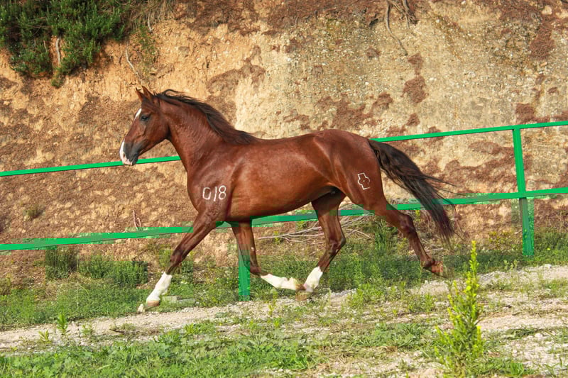 Vijfjarige hengst, begonnen met rijden met een zeer goed karakter, 1,60 m op de schoft. Schenkelruin met drie witte benen en een wit gezicht. Spectaculaire gangen en unieke schoonheid.