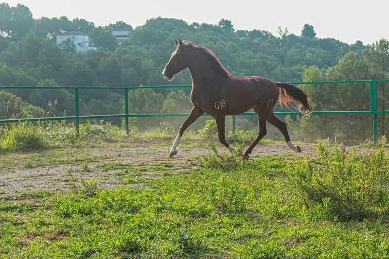 Pferd mit 5 Jahren, angefangen zu reiten, mit sehr gutem Charakter, 1,60 m Stockmaß. Fuchs mit 3 weißen Beinen und einer weißen Blesse. Spektakuläre Gänge und einzigartige Schönheit.