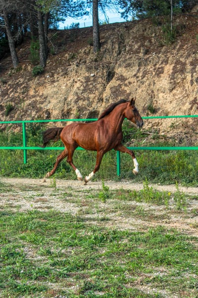 Caballo con 5 años, empezado a montar con muy buen carácter, 1'60 a la cruz. Alazán con 3 patas blancas y careto. Aires espectaculares y belleza única.