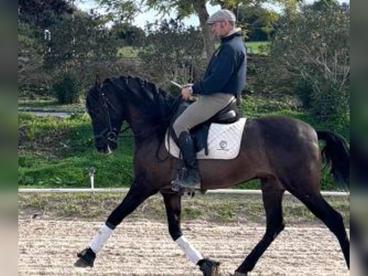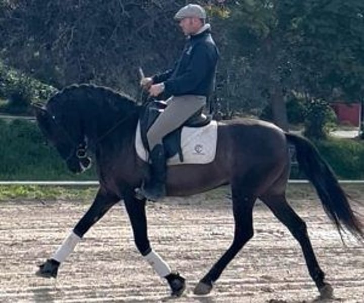 A simple, balanced and pleasant horse for everyday use This black horse is already gelded and is distinguished by his good temperament and consistency in his work. In the arena, he is active and cooperative, always attentive to the rider's aids. He is also accustomed to going out for rides, both in the countryside and in the village, accompanied by other horses. He is comfortable, easy on a daily basis, and a pleasure to ride. A horse that's a joy to work with... and also to ride out for relaxation, without anything getting complicated. In addition, he is a very good price opportunity for a PRE of this coat, particularly sought after and rare, which make him a very interesting option on the current market. A horse designed to be truly appreciated by someone who values both track work and outings and the daily relationship. At IberHorse, we select horses with discernment, integrity, and a solid foundation. If this horse is a good fit for you, contact us and we'll discuss it further.