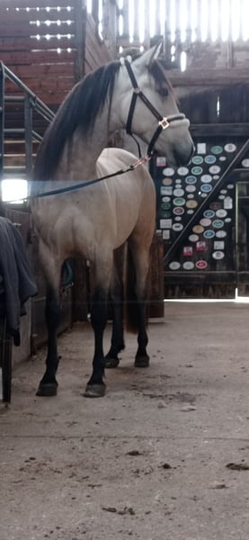 6-year-old gelding in a particularly light bay color. In summer, he has cream-colored coat, in winter, he is white. He is trained in the basics, with beginnings in lateral movements and simple flying changes. Spanish walk from the saddle as well as from the ground. There is potential for further development, but there is a lack of time to currently promote it. He is not suitable for beginners or weak riders. Young girls with talent and riding skills are no problem. He has character and a day-dependent "go." He covers ground very well, as he already stands strongly in the Baroque style. Rider - 184 cm tall. Imported at 1 year old. Contains military and Cartujan lines. No allergies, no surgeries... Equipment is available for purchase. He masters circus elements... beginnings of piaffe, bow, lateral movements at trot... You can see his pedigree at the following link: https://www.lgancce.com/lgpreancce/asp-publico/arbolGenealogicoPRE/ConsultarArbolGenealogicoPRE.aspx?ID=AxawRK0rW/U= He stands on the trailer like a pro, although he sometimes lacks routine when loading. He stands calmly and quietly for the veterinarian and farrier, but has always been barefoot until now. He goes out alone into the field, is familiar with tractors, cars, dogs, etc. I charge a fee of €25 per ride, which can be deducted from the purchase price.