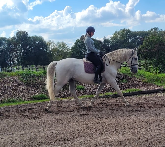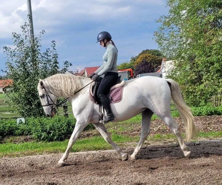 SANTOS is a beautiful, very elegant P.R.E. gray gelding of absolute top class. His God-given calmness and serenity allow even a somewhat insecure rider to quickly gain trust in this magnificent fellow. SANTOS forgives riding mistakes and responds when he senses that his rider is becoming unsure. SANTOS is a horse that literally looks out for his rider. He is very easy to ride and comfortable to sit on. He has three beautiful basic gaits. He is very people-oriented and loves to be pampered. He particularly enjoys working with children and young people. We have not been able to discover anything that could significantly disturb this magnificent fellow's calmness. Whether in the arena, all-weather arena, or on the trail, SANTOS moves forward well, is not lazy, but also not too fast. SANTOS is a horse that adapts to the demands of his rider, who adjusts to his rider. SANTOS embodies the ideal family horse and is also suitable for somewhat insecure riders. Not only under saddle but also during groundwork and in everyday handling, SANTOS provides security with his good-natured temperament and shows his great trust in humans. We can also very well imagine SANTOS as a therapy horse or as a teacher in a riding school. A horse that does not present its person with new challenges every day. For more information about our horses and our work, please contact 0171/5269002 Hubert Seitle and 0151/12775701 Uta Großmann. General information about our horses and our work can also be found at www.ps-seitle.de THERAPY HORSES Horse Sports Seitle in DONAUMOOS