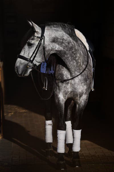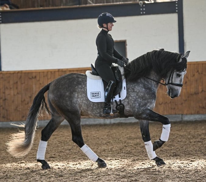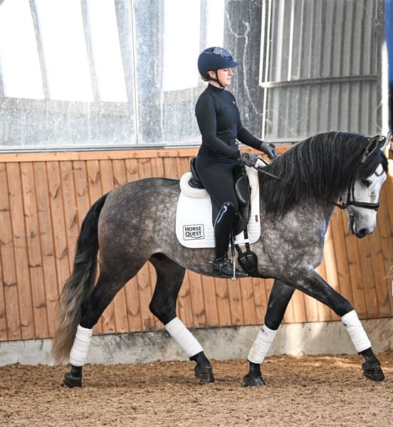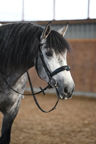 Potro de 6 años, con un carácter muy noble y con papeles completos de la ANCCE, aproximadamente 1,65 m de altura. Paolo es un caballo excepcionalmente grande, con movimientos destacados, entrenado en doma a nivel L/M y que domina el salto a nivel A. Es un caballo con tres aires naturales, y tanto su trotón como su galope son verdaderamente mágicos. Se mueve con la elegancia de un mestizo noble. Ya sea para doma, salto, paseos o trabajo en tierra, siempre da el 100 %. Con mucho trabajo, será un caballo de competición excepcional. En cuanto a su movimiento, probablemente sea el más refinado de los escandinavos. No lo vendo a quien busque un caballo tordo, sino a alguien que realmente quiera trabajar con él y tenga planes para su futuro. El precio es algo inferior, ya que para mí lo más importante es la persona y el hogar donde él vaya, más que el valor en sí. Posee papeles completos. Es muy sociable, fuerte de nervios y siempre amable.