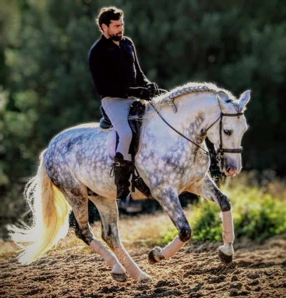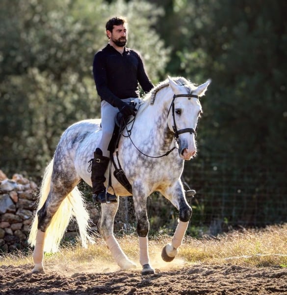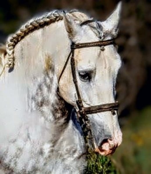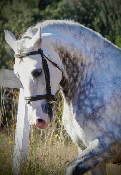 KALAMBRUJO... A very special gentleman in search of his *forever home*. This impressively beautiful PRE stallion is 7.5 years old, stands 1.58 meters tall, and is muscular. He captivates not only with his friendly and human-oriented nature but also as an overall striking presence. With his exceptionally comfortable gaits, he is perfectly suited for Working Equitation, dressage, and recreational riding. His outstanding pedigree (Plaza de Armas) already hints at his high quality and his incredibly lovable character. The stallion is well-trained, completely reliable in handling, and an excellent choice for riders seeking a versatile partner. He is primarily ridden in the terrain, bringing 100% safety and routine to every ride. In the riding arena, he works convincingly and is pleasant to ride in all gaits. He already masters simple lateral movements at walk and trot. His very agreeable nature makes him an ideal companion for trail rides, walks, and relaxed training sessions. KALAMBRUJO is ideally suited for the ambitious leisure rider, for those returning to riding, and even for beginners, as he provides security and a pleasant riding experience. If you like this charming grey, please contact me with your phone number so I can get in touch with you as soon as possible. We always have horses with different levels of training available. All horses come from private, loving owners. For inquiries or further information, please feel free to contact me. A personal meeting is always possible!