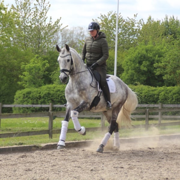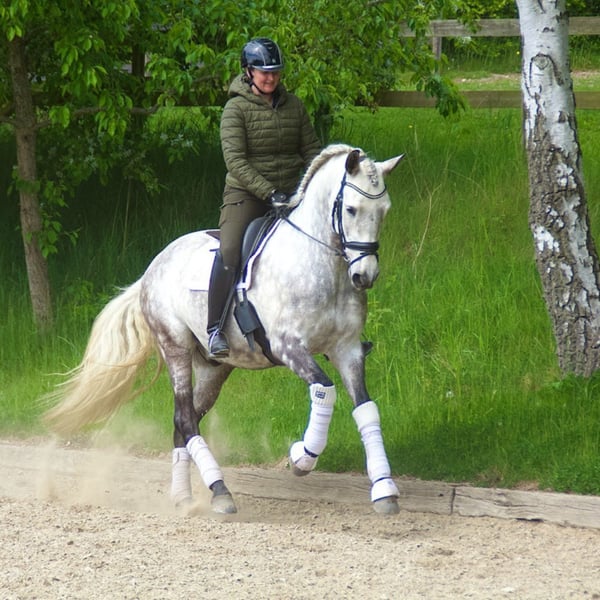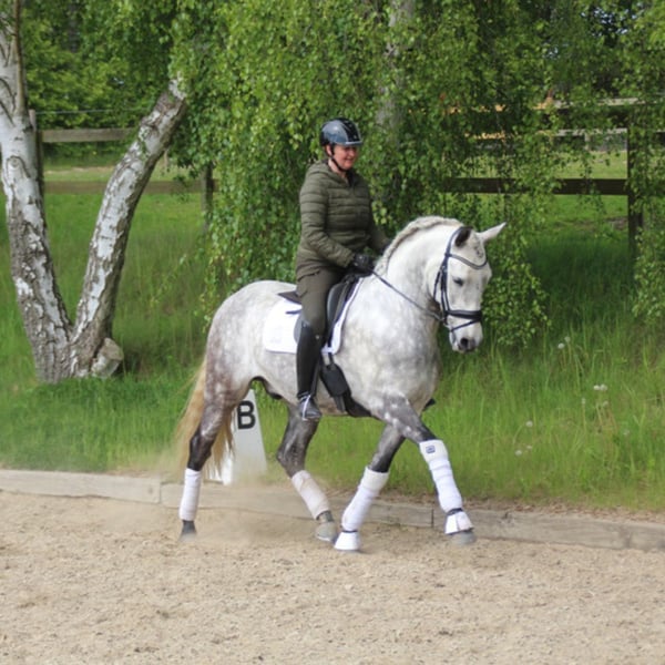 We present an elegant, baroque-looking horse born in 2020 and measuring 167 cm tall, who stands out for his beauty, morphological harmony, and functionality. He is an ideal horse for experienced amateur riders seeking a reliable companion with quality movement. Regarding his training under saddle, he responds correctly and clearly to aids, displaying a cooperative and balanced attitude. He is currently working on advanced dressage exercises, smoothly executing piaffes, pirouettes, and supports, making him a versatile and highly attractive horse for those who want to enjoy recreational riding with added technical skill. His character is noble and manageable, making him easy to handle both daily and enjoyable in the arena. His baroque physique provides presence and elegance, highly appreciated characteristics in this type of horse, while being comfortable and pleasant to ride. This horse is an excellent choice for those seeking a beautiful, functional, and safe horse, with which to enjoy riding at a challenging level yet accessible to an experienced enthusiast.