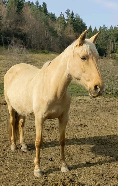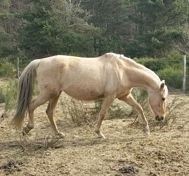 Par choix d'élevage et réduction d'effectif, nous proposons Cora XXI jument palomino Pure Race Espagnole de 10 ans APTA, 1m58, testée négative à la PSSM1. Poulinière expérimentée, avec une éducation de base ( licolée, marche en longe, donne les pieds, monte en van, gentille aux soins, écho ok), sympa aux soins, maternelle. C'est un modèle plutôt sport, agréée à produire en Selle Français aussi. Actuellement suitée elle pourra rejoindre sa nouvelle maison en avril/mai, vermifugée, parée, vaccinée grippe et tétanos. Le tarif est discutable après avoir vu la jument.