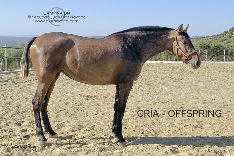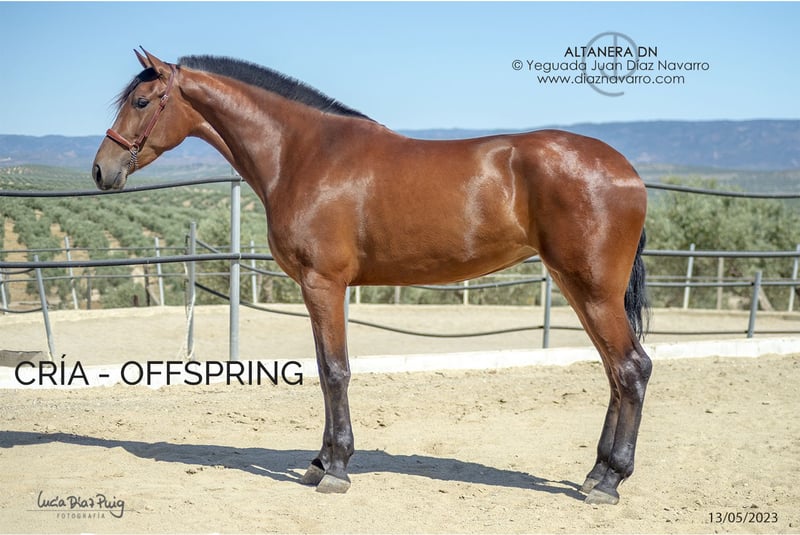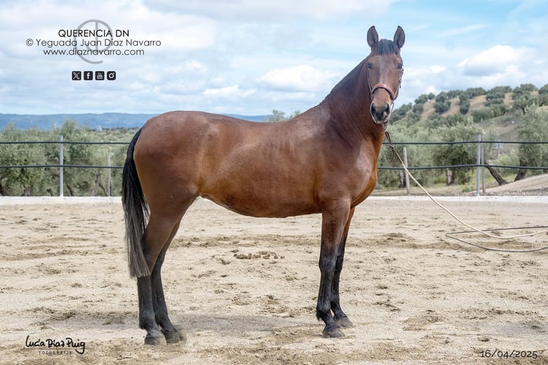 Hier ist die professionelle Übersetzung des Inserats vom Spanischen ins Deutsche: --- **Gelegenheit, eine funktionale und trächtige Stute zu erwerben!** Zum Verkauf steht eine hervorragende PRE-Stute, geboren im Jahr 2013. Sie ist kastanienfarben, mit einer Größe von 168 cm. Genetische Abstammung (Genotyp): ggAaEeCCNN Ausbildung: Eingefahren im Kutschwagen. Bemerkungen: Sehr gute Herkunft und Bewegungen. Sie vererbt Nachkommen in verschiedenen Farben, darunter Bay, Perlino, Palomino, Schwarz, Aschgrau, Kastanien und Tordillo. Trächtig: Hat im Jahr 2024 eine Palomino-Stute von Norte A zur Welt gebracht. Erwartet Fohlen von Mendigo VI im Jahr 2026. Linien: Lebrijano III, Lego, Deco, Cepellón, Velero XI, Colombiano III. Militärgestüt, D. Francisco Lazo, Vizconde de la Montesina, Urquijo, D. Benito Zoido, Bohorquez. Verpassen Sie nicht die Chance, ein qualitativ hochwertiges und renommiertes Exemplar zu erwerben. Für weitere Informationen und Details stehen wir Ihnen gern zur Verfügung.