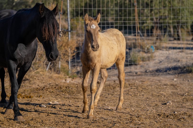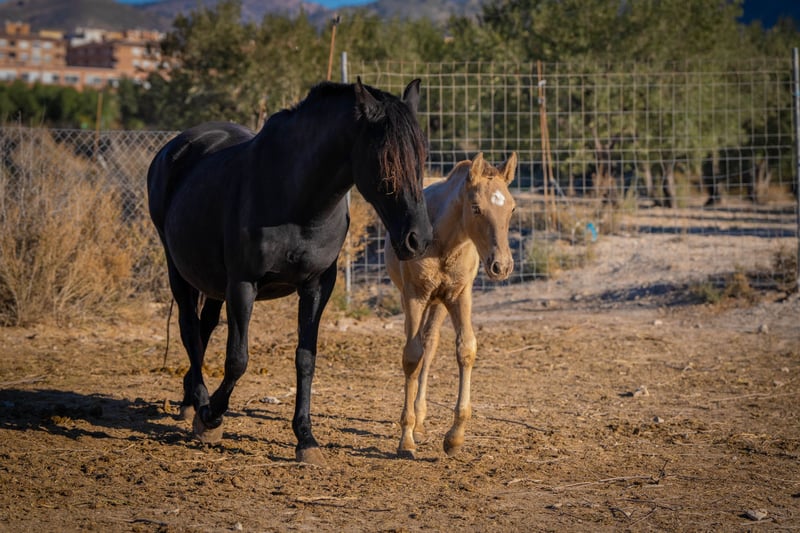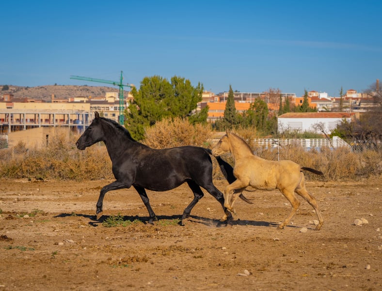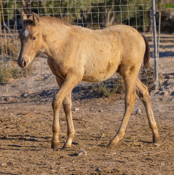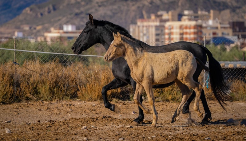 Yegua preñada: Yegua de cría fuerte y experimentada con potro al pie. La yegua se vende sin potro. La yegua es portadora del gen PRl y tendrá potros 100% champagne con semental de color champagne. El potro podría ser incluso portador de Dun ya que tiene la cabeza oscura y marcas de anguila. Más información en: www.caballoria.com