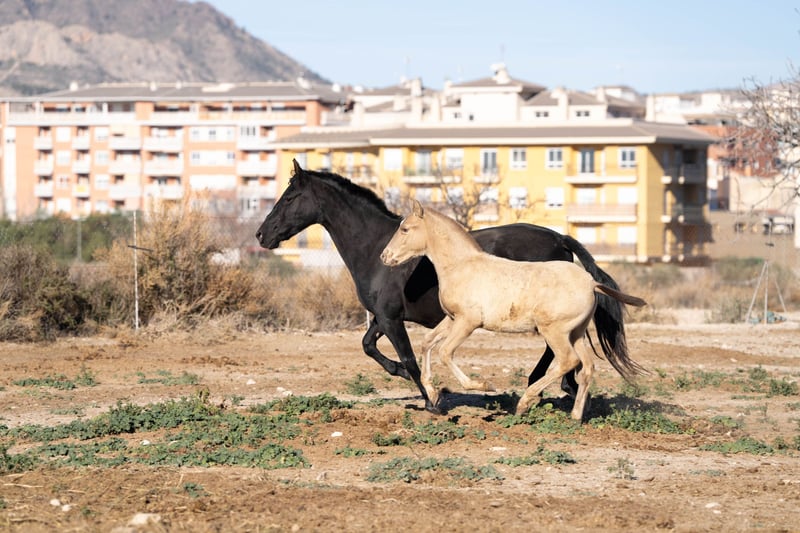 Tragende Stute: Bewegungsstarke und erfahrene Zuchtstute mit Fohlen bei Fuß. Die Stute wird ohne Fohlen verkauft. Stute trägt PRl Gen und bekommt mit Champagne farbenen Deckhengst zu 100% champagne Fohlen. Das Fohlen könnte sogar Dun Träger sein, da es einen dunklen Kopf hat und einen Aalstrich. Mehr Infos unter: www.caballoria.com