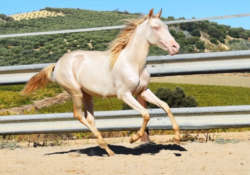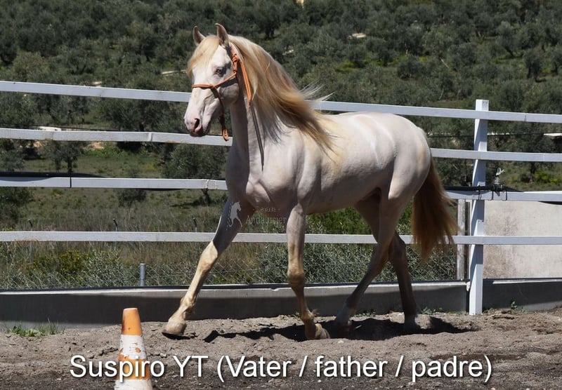 Sweet temperament, curious, affectionate, people-oriented, rough, outside with other foals, good movement and pedigree, unique color, PRE Perlino (CrCr) with papers, Piro + Arteritis negative. Pedigree includes Alquilino Moya, Yeguada el Bayo, Señoria de Bariain, Bohorquez. Great-grandfather Redondo VII and great-great-grandfather Gaucho III are qualified. www.elegante-andalusier.com