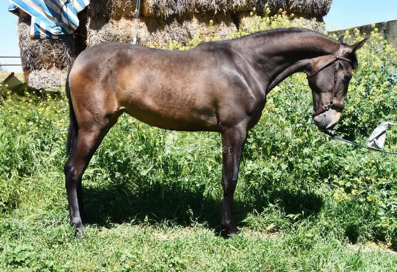 cher caractère, curieux, brut, est dehors avec d'autres juments, couleur spéciale, fauve PRE avec papiers, bonnes allures et origines, origines : Alfredo Gala, Pablo Perez Jimenez, Castillo Villafranca, Andres Holgado Dianes, Uropa Mariscal de Torre et Ururopa Remache XIII sont qualifiés www.elegante-andalusier.com
