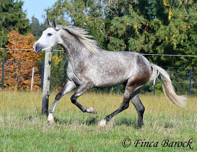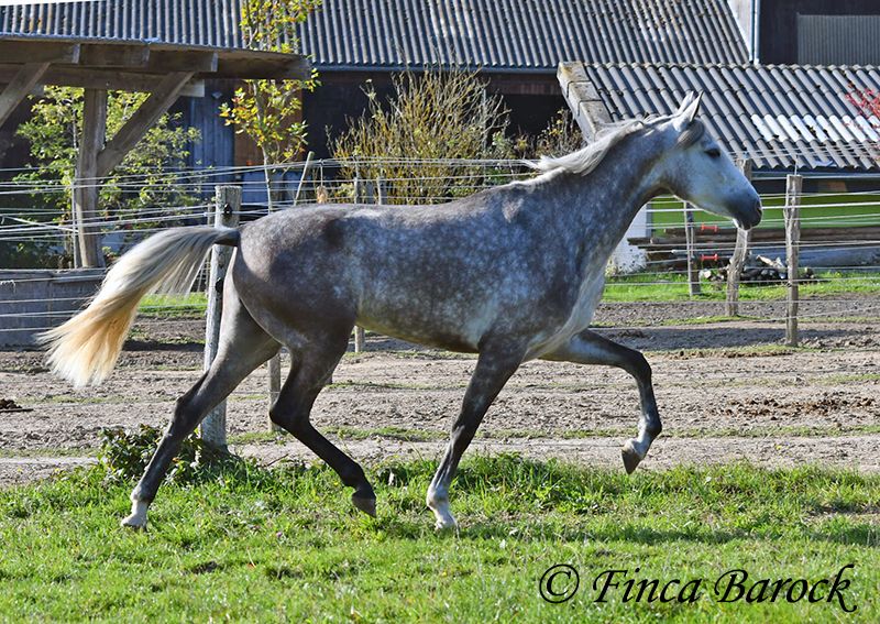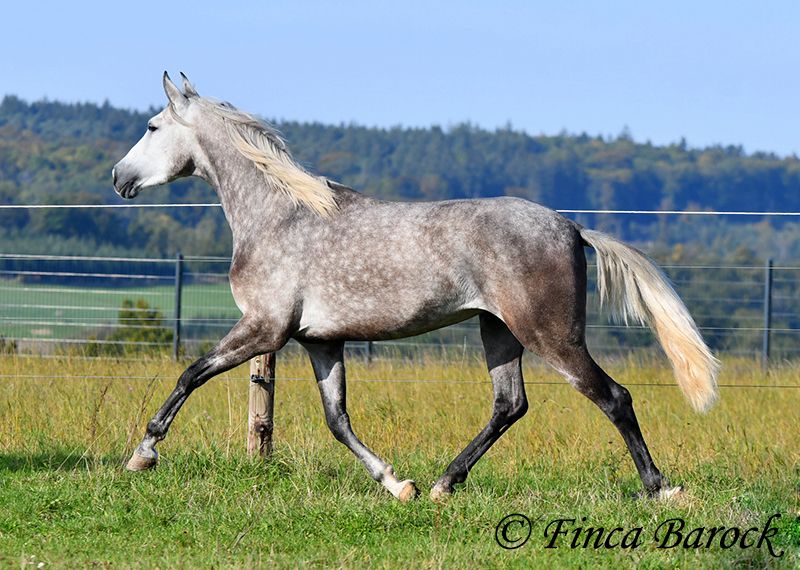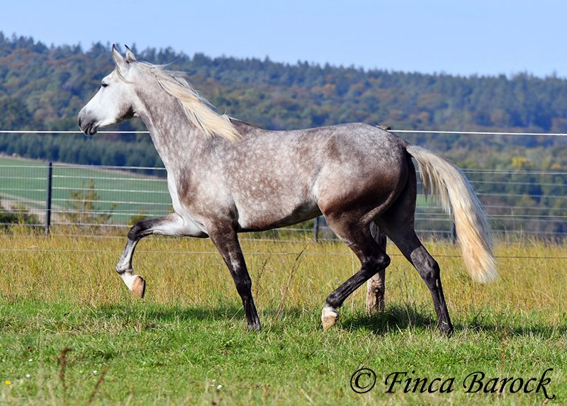 Rasse: PRE Name: Buleria AR IV Geschlecht: Stute Stockmaß: 159 cm Alter: 20.09.2022 Farbe: Schimmel Preis: 9800 € Vater: Zurito MIBXBII v. Algabeño MIBXII Mutter: Dakota CB v. Quebrado HBM II Buleria ist eine super süsse hochbeinige Maus mit einem freundlichen Charakter. Sie kennt das longieren am Kappzaum mit Sattel und Trense. Sie ist leicht in den GGA angeritten und zeigt sich als echte Musterschülerin. Hervorzuheben sind ihre sitzbequemen Bewegungen. Sie ist neugierig und aufgeschlossen, freut sich über neue Aufgaben und macht souverän mit. Wenn krach auf dem Hof ist (Traktor, Quart, Helilandung auf dem Nachbarfeld) steht sie immer in ihrer Paddockbox und schaut sich alles genau an. So freu nach dem Motto – cool da ist was los, das muss ich mir anschauen! Buleria kennt gemischte Herdenhaltung. Bei kleinen Spaziergängen um den Hof zeigt sie sich wenig umweltorientiert und eher neugierig bei ungekannten Dingen. Mit ihr bekommt man eine junge Lady, welche bereits gute Grundlagen gelegt bekommen hat, aber noch alle Wege offen stehen. inkl. klinischer tierärztlicher Untersuchung und Röntgenbildern Kontakt: Finca Barock, Tel. 0173-696 31 81, 56291 Wiebelsheim