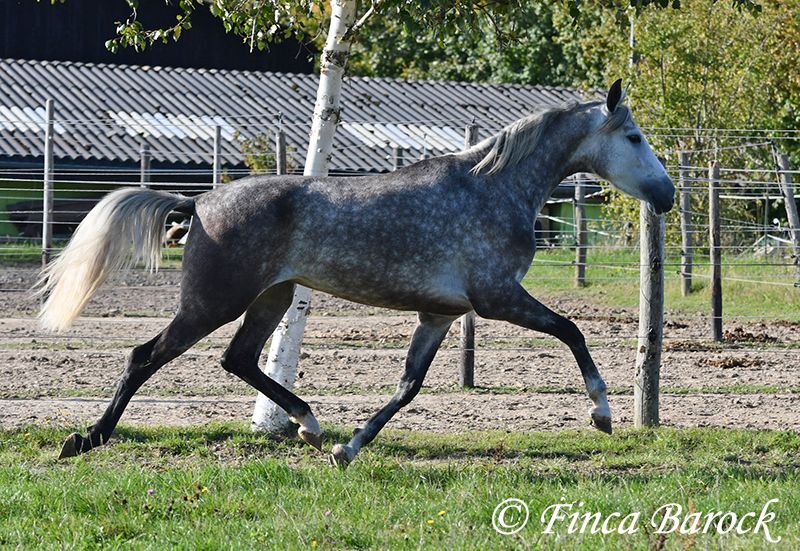 Ras: PRE Naam: Buleria AR IV Geslacht: Merrie Stockmaat: 1,59 m Geboren: 20-09-2022 Kleur: Schimmel Prijs: € 9.800 Vader: Zurito MIBXBII v. Algabeño MIBXII Moeder: Dakota CB v. Quebrado HBM II Buleria is een ontzettend lieve, lange en elegante merrie met een vriendelijk karakter. Ze kent het longeren met de cavessons, zowel met zadel als bit. Ze is licht aanrijbaar in de grondwerk- en gangenarbeid en toont zich als een echte leermeester. Haar zitcomfortabele bewegingen zijn bijzonder opvallend. Ze is nieuwsgierig en open, geniet van nieuwe taken en werkt altijd zelfverzekerd mee. Bij geluiden op de manege (tractor, kar, helikopter op het naburige veld) blijft ze rustig in haar paddockbox en kijkt aandachtig om zich heen. Ze lijkt te denken: "Hier gebeurt veel, dat wil ik zeker bekijken!" Buleria is bekend met gemengde groepshoudingen. Tijdens korte wandelingetjes rondom de manege toont ze zich weinig schrikachtig en eerder nieuwsgierig naar onbekende dingen. Met haar krijgt u een jonge dame die al goede basisvaardigheden heeft, maar nog alle opties openhoudt voor verdere training. Inclusief klinisch dierenartsonderzoek en röntgenfoto’s. Contact: Finca Barock, Tel. 0173-696 31 81, 56291 Wiebelsheim