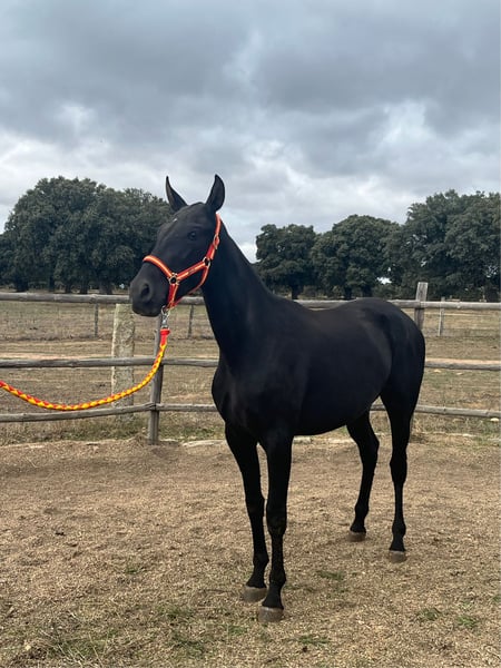 Tormenta Tormenta is a 2 year old, 3 month old black coat filly. She was born on 6-07-2022. She has her Pura Raza Española card and is registered with ANCCE. Her genealogical line is very distinguished, coming from former champions, being granddaughter of Mercurio de Centurión and great-granddaughter of Rondeño IX (double champion of the SICAB competition in 2002 and 2005). Her character is unbeatable, highlighting her great nobility towards people and her great capacity for learning. She is used to riding right-handed with her bridle and is not afraid to put it on. She has received her stable training from a very early age to make her a very gentle and easy to handle filly. She currently has an approximate height of 1,52 cm with three gaites of walk, trot and canter, standing out especially in her great trot. Her very special movements make her a very good dressage horse as you can see in the video.