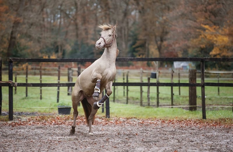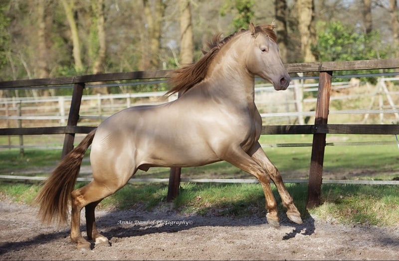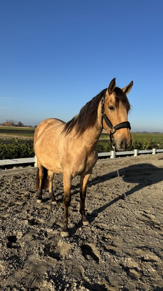 ✨ Beautiful mare born in 2022 with a golden temperament and presence ✨ This sweet and willing PRÉ mare is a true eye-catcher, not only because of her distinctive golden appearance but also due to her lovely character. She currently measures approximately 1.61 m, and given her young age, she is expected to grow a little more. Her sire is Mar Wonderful, and she has good paperwork. The mare holds a Carta. She is saddle-trained, responds well to work, and is honest and well-behaved. The rider in the photo is 14 years old, which further highlights her reliable and gentle nature. We are currently continuing her training at a relaxed pace. She is traffic-safe, sensible, and level-headed, and has already been on several outdoor rides, which she clearly enjoys. Thanks to her calm, social, and cooperative temperament, she is also very suitable as a therapy or coaching horse. The mare is easy to shoe, has recently seen the dentist, receives regular deworming, and her vaccinations are fully up to date. She has been raised in the Netherlands since foalhood. She is social and friendly towards other horses and gets along well with both mares and geldings. Last summer, she spent day and night outside in a herd. Additionally, she comes with a genetic color analysis report and is in foal to the beautiful stallion Sonador PT. She is due in early May and is carrying a pearl-gen foal, making her even more special. ✔ Versatile for various disciplines ✔ Well-behaved, sensible, and willing ✔ Healthy with no flaws An honest mare with great potential for sport, recreation, breeding, or coaching. ✔ Clinically approved in January 2026 Please only respond if you are genuinely interested! Price is for mare with foal.