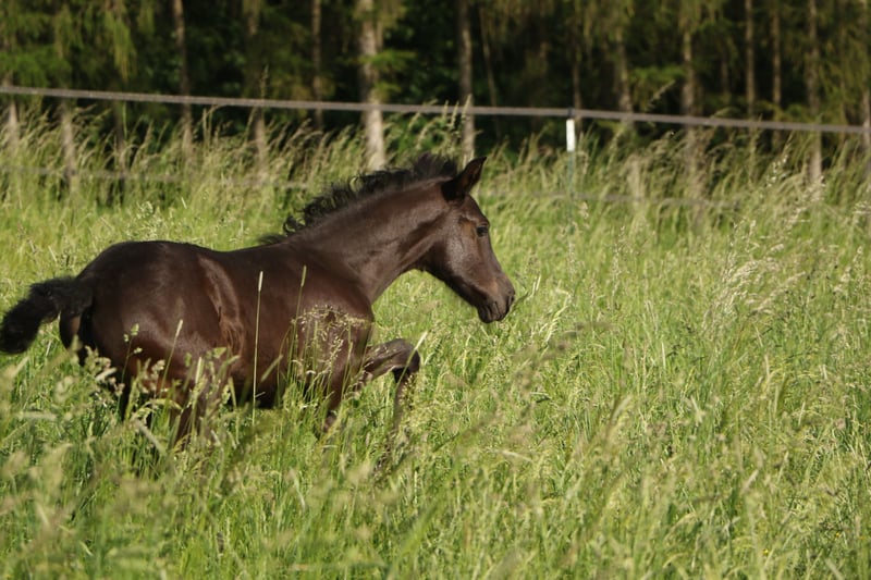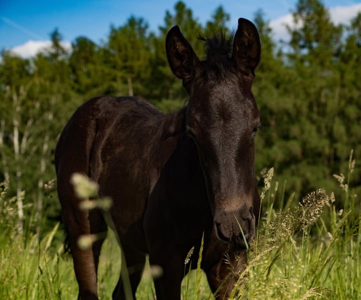 Alhaja ist eine sehr ausdrucksstarke junge Rappstute (Glanzrappe ohne Abzeichen) mit raumgreifenden Bewegungen.