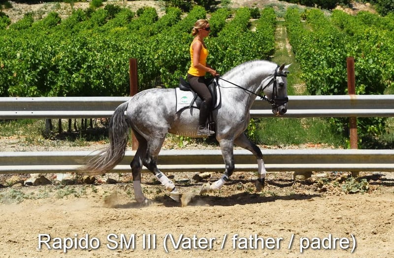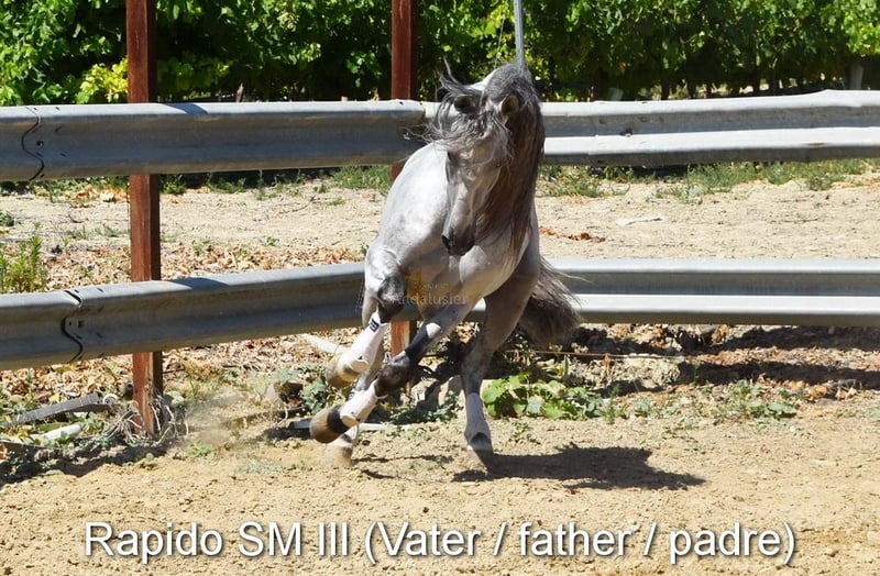 fin karaktär med temperament, rå, står ute med andra ston, bra rörelser, härstamning: Escalera, Yeguada de Ymas, Yeguada Militar, media Guitarra, Paco Marti, Jesus Gil y Gil www.elegante-andalusier.com