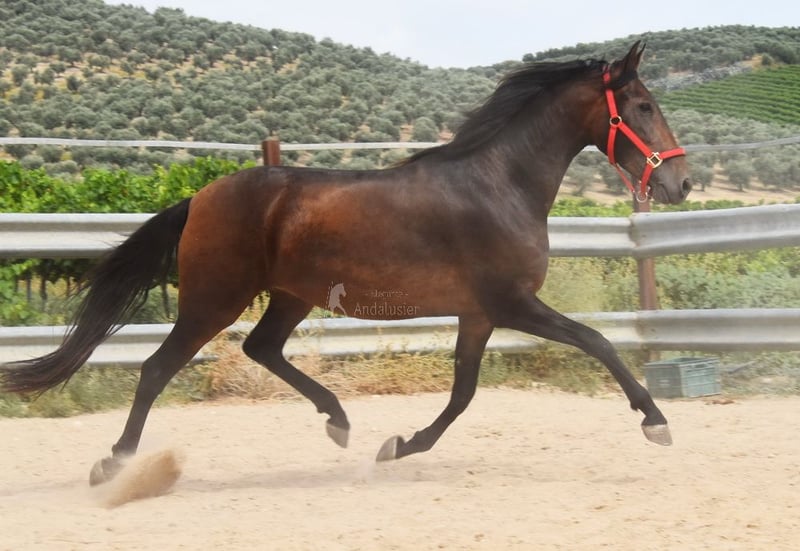 nice character with temperament, raw, stands outside with other mares, good movements, pedigree: Escalera, Yeguada de Ymas, Yeguada Militar, media Guitarra, Paco Marti, Jesus Gil y Gil www.elegante-andalusier.com