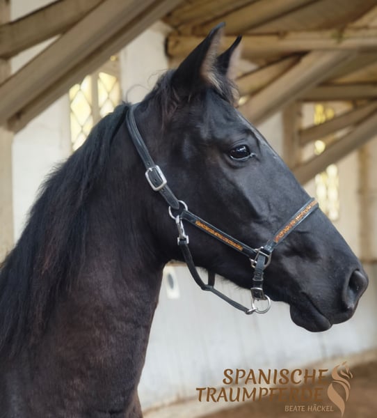 PRE-Stute QUINTA SH – Eleganz und Charme in Rappfarbe Unsere wunderschöne PRE-Stute QUINTA SH, geboren im Jahr 2020 möchte von Traventhal aus ihren Herzensmenschen finden. Mit ihrem komfortablen Stockmaß von 159 cm vereint sie barocke Eleganz mit kraftvoller Präsenz. Ihr wundervolle glänzendes, lackschwarzes Fell unterstreicht ihre Ausstrahlung und macht sie zu einem echten Blickfang. Diese barocke Schönheit besticht durch ihren angenehmen Charakter und ihr freundliches, höfliches Wesen. Sie ist angeritten, gesund und bereit für den weiteren Weg im Freizeitbereich, im Dressursport oder in der Zucht. Bei Interesse oder für weitere Informationen stehe ich gerne, auch telefonisch, zur Verfügung. Ein Kennenlernen unsere QUINTA SH ist nach Absprache möglich.