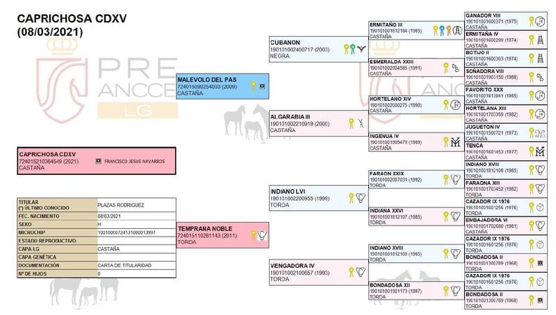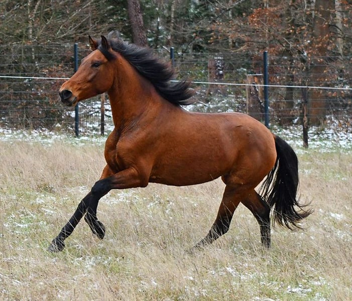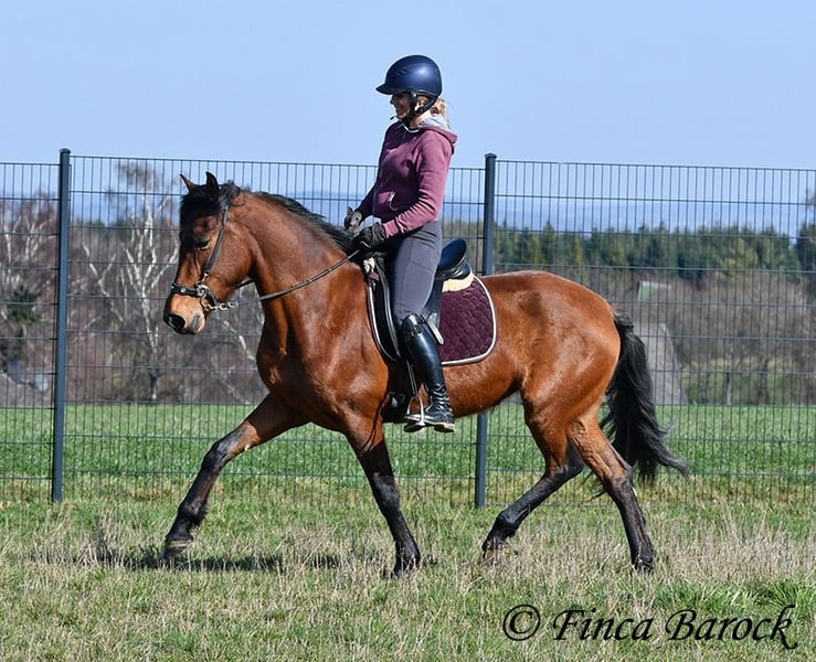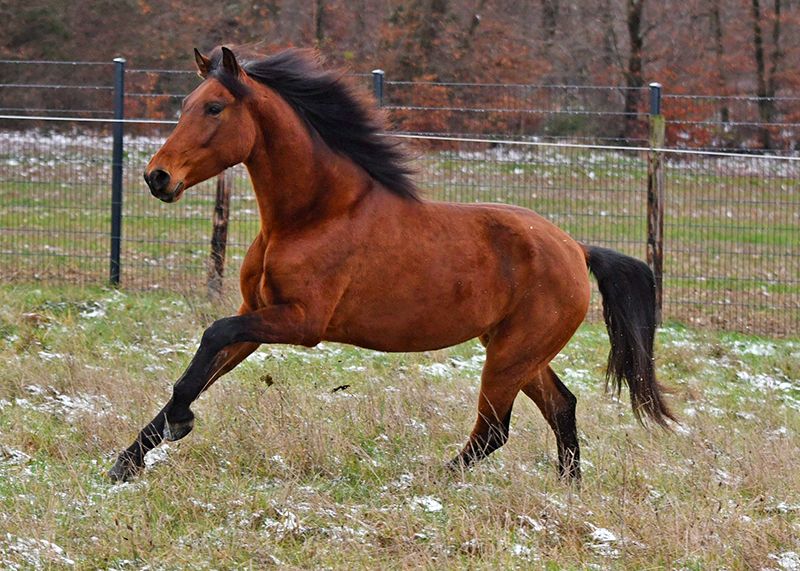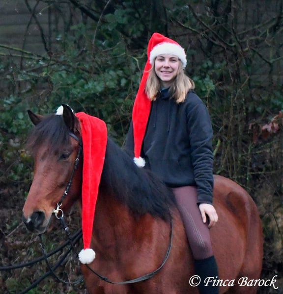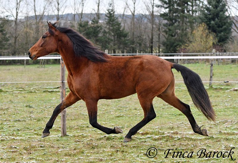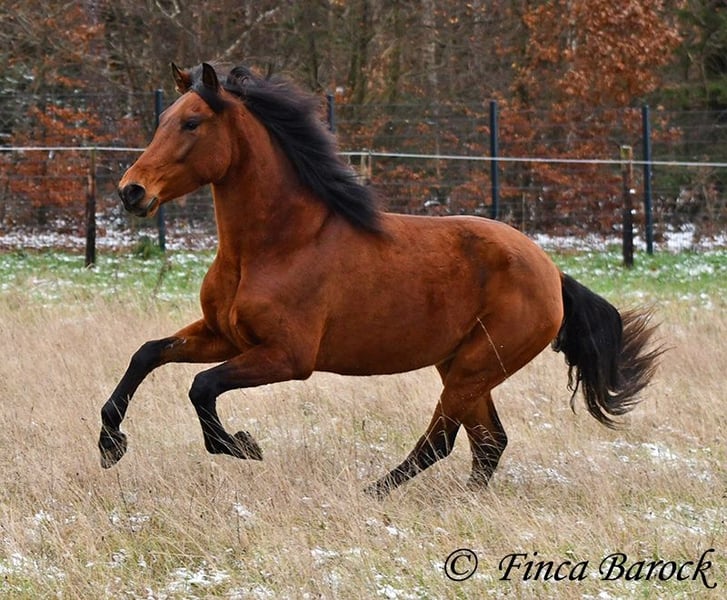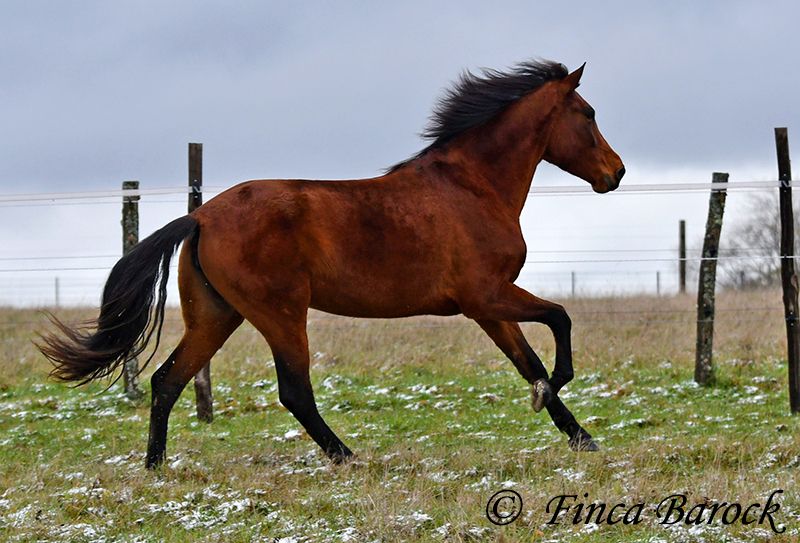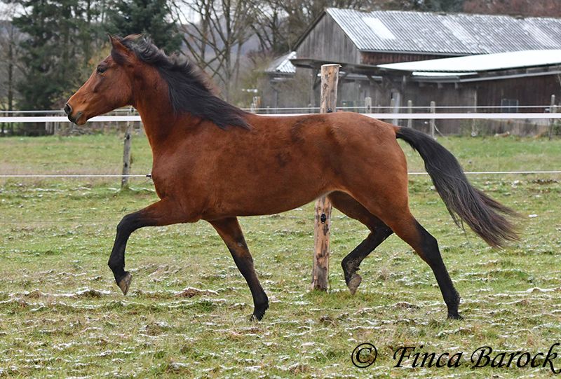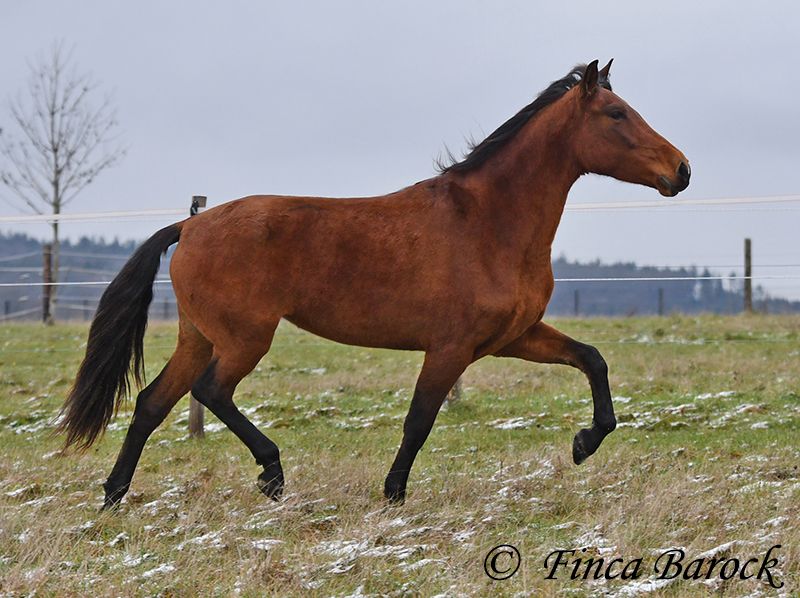 Rasse: PRE Name: Caprichosa CDXV Geschlecht: Stute Stockmaß: 160 cm Alter: 08.03.2021 Farbe: Braun Preis: 7500 € Vater: Malevolo del Pas v. Cubanon (Joven Reproductor) v. Ermitaño III (Majorante + Elite) Mutter: Temprana Noble v. Indiano LVI Caprichosa, ist eine hübsche, schlanke, bewegungsstarke Lady mit freundlichem Charakter. Caprichosa wurde gekauft um als Zuchtstute eingesetzt zu werden. Manchmal kommt es aber im Leben dann doch anders und die Pläne der Besitzerin konnten aus persönlichen Gründen nicht umgesetzt werden. So hatte die süße Caprichosa einen schönen Sommer auf der Weide und wurde nur gelegentlich geritten. Bei uns wird Sie seit Oktober wieder gearbeitet. Sie zeigt sich unter dem Reiter als arbeitswillig, sitzbequem, fleißig und lernbereit. Caprichosa ist in den GGA geritten. Ihr besonderes Steckenpferd ist das Gelände. Hier fühlt Sie sich absolut Zuhause. Ob in der Gruppe oder auch alleine. Auch hier zeigte sie sich aufmerksam, schaut sich neue Sachen kurz an und lässt sich dann aber gut überzeugen, weiter zu gehen. Insgesamt kennt Caprichosa mehr Gelände als Viereck. Caprichosa hat ein Raumgreifenden Trab und eine tolle Bergaufgaloppade. Ihre Bewegungen sind typvoll und sitzbequem. Auch zu einem Sprung sagt sie nicht nein und wäre noch vielseitig förderbar. Eine tolle Maus mit soliden Grundlagen die auf neue Abendteuer wartet! Kontakt: Finca Barock, Tel. 0173-696 31 81, 56291 Wiebelsheim