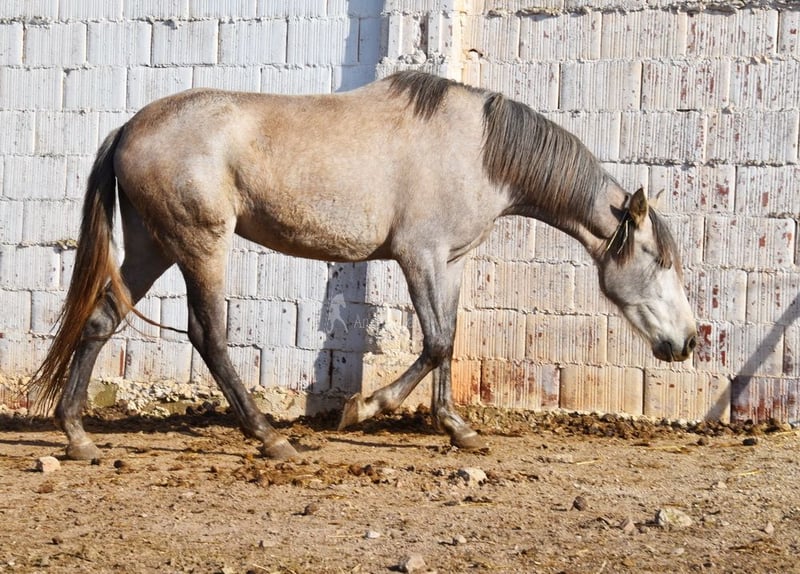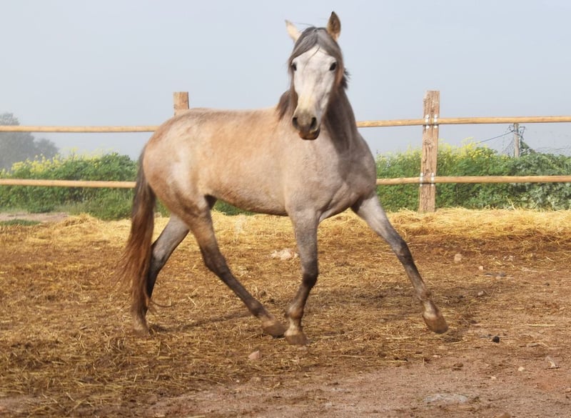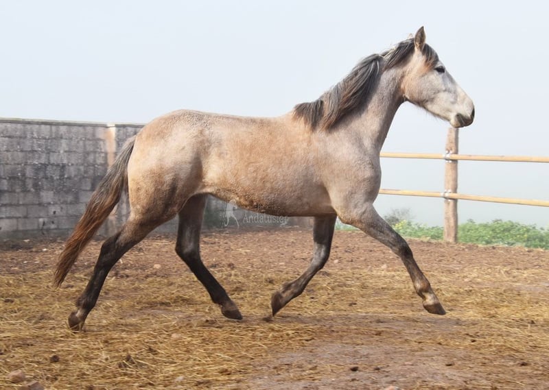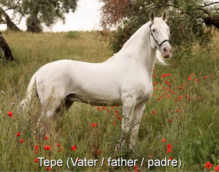 caractère doux, curieux, affectueux, non débourré, longé, vit avec d'autres juments à l'extérieur, bonnes mouvements et origine, origine : Plaza de Armas, Yeguada Militar, Yeguada Vilaire, grand-père Judio VII est qualifié www.elegante-andalusier.com
