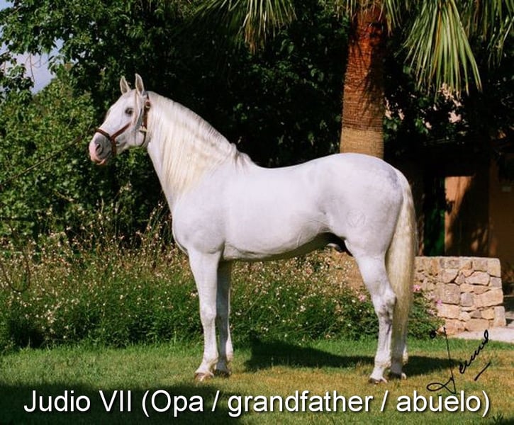 carattere gentile, curioso, affettuoso, grezzo, lungato, sta con altre fattrici all'aperto, buone movenze e genealogia, genealogia: Plaza de Armas, Yeguada Militar, Yeguada Vilaire, nonno Judio VII è qualificato www.elegante-andalusier.com