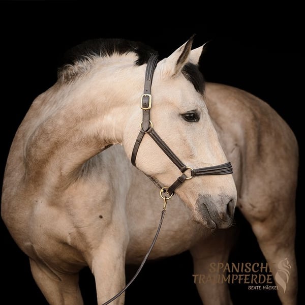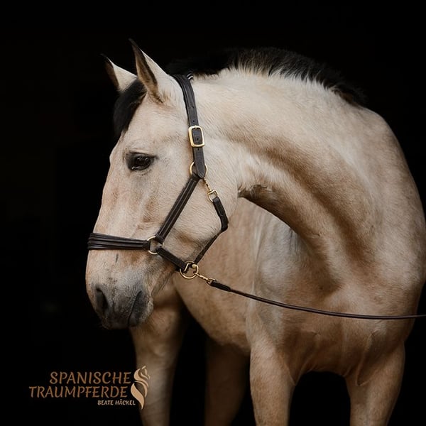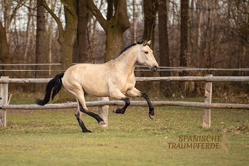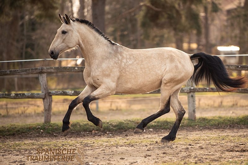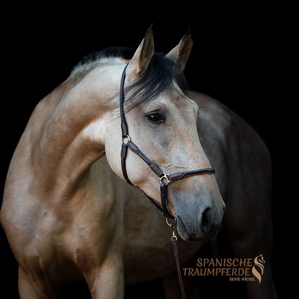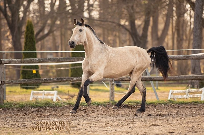Diese wunderschöne, großrahmige PRE-Falbstute aus privater Hand sucht eine neue Herausforderung. RIOJA überzeugt durch ihren angenehmen Fleiß, sowie durch raumgreifende, schwungvolle und zugleich sehr sitzbequeme Bewegungen mit schönem Vorwärtsdrang. Sie zeigt große Freude an der Arbeit mit ihrem Menschen und verfügt bereits über eine solide Grundausbildung – sowohl vom Boden aus, als auch unter dem Sattel. Damit ist sie bestens vorbereitet für ihren weiteren Weg, sei es in Richtung Working Equitation, Dressur oder im Gelände. RIOJA ist es gewohnt, bei Wind und Wetter draußen zu sein und kennt die Haltung in der Herde. Dort zeigt sie sich absolut unkompliziert und lebt im harmonischen Einklang mit anderen Stuten auf der Weide. Ihr ausgeglichener Charakter und ihre Gelassenheit gegenüber Außenreizen machen sie zu einer verlässlichen und nervenstarken Partnerin im Alltag, wie auch in neuen Situationen. Als vielseitige, motivierte und menschenbezogene Stute wünscht sie sich eine enge Partnerschaft und geht mit ihrem Herzensmenschen zuverlässig durch dick und dünn – ob im Training oder auf abwechslungsreichen Ausritten. Wer ein sozialverträgliches, engagiertes, kräftiges Pferd sucht, das auch größere Reiter gut abdeckt, findet in der wunderbaren PRE-Stute RIOJA SH eine treue und leistungsbereite Partnerin. Röntgenbilder sind vorhanden Standort: 23795 Traventhal Ein Kennenlernen unserer RIOJA SH ist nach Absprache nahezu jederzeit möglich. Für diesen Kennenlerntermin aus Bodenarbeit, Spazierengehen, gegebenenfalls Probereiten, nehme ich mir ausreichend Zeit, damit du dein Traumpferd in allen Facetten ganz in Ruhe kennenlernen kann. Dafür berechne ich zum Schutz unserer Pferde und um Reittourismus vorzubeugen eine Pauschale von 50 EUR.